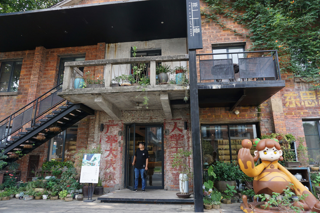这栋厂房充满了过往的元素。红砖墙,斑驳的墙面上的生产标语,黑色铁质楼梯都是我童年对工厂的记忆。这栋厂房现在摇身一变成为一家上茶下咖的餐饮店。楼下喝杯咖啡,上楼来杯茶,一派小资调调。