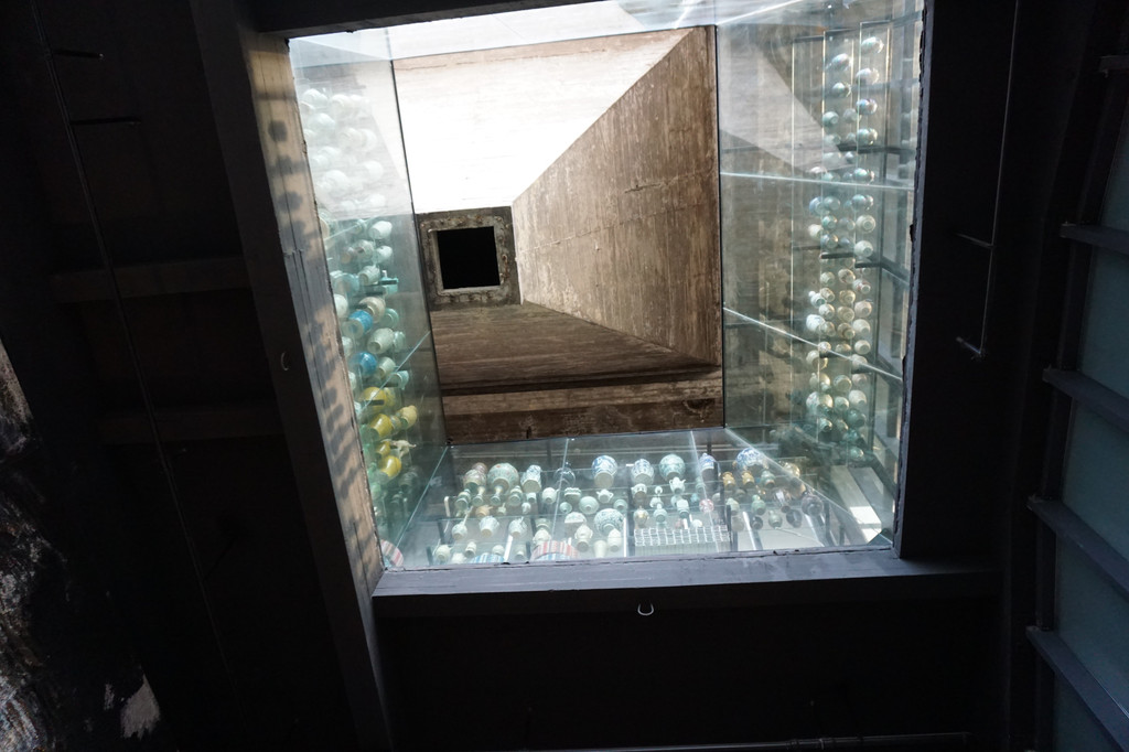 咖啡店内仰头看到的场景,一个天井造型,周边的玻璃映照着一个个形状各异,大小不同的花瓶,即现代又有景德镇特色,觉得很梦幻。