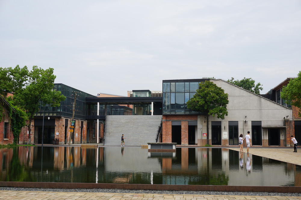 苏式风格锯齿状“包豪斯”厂房、高耸入云的烟囱,小桥流水式的水景环绕。走在这里,一股文艺复古的艺术气息扑面而来。美术馆前一汪水池,有水的地方立刻心生灵动。水面映照着建筑。高耸的烟囱与高大的厂房倒映在水中,岸上水中相互辉映。这样的广场有一个浪漫的名字——梦瑶广场,它是整个园区公共交流活动的场所。
