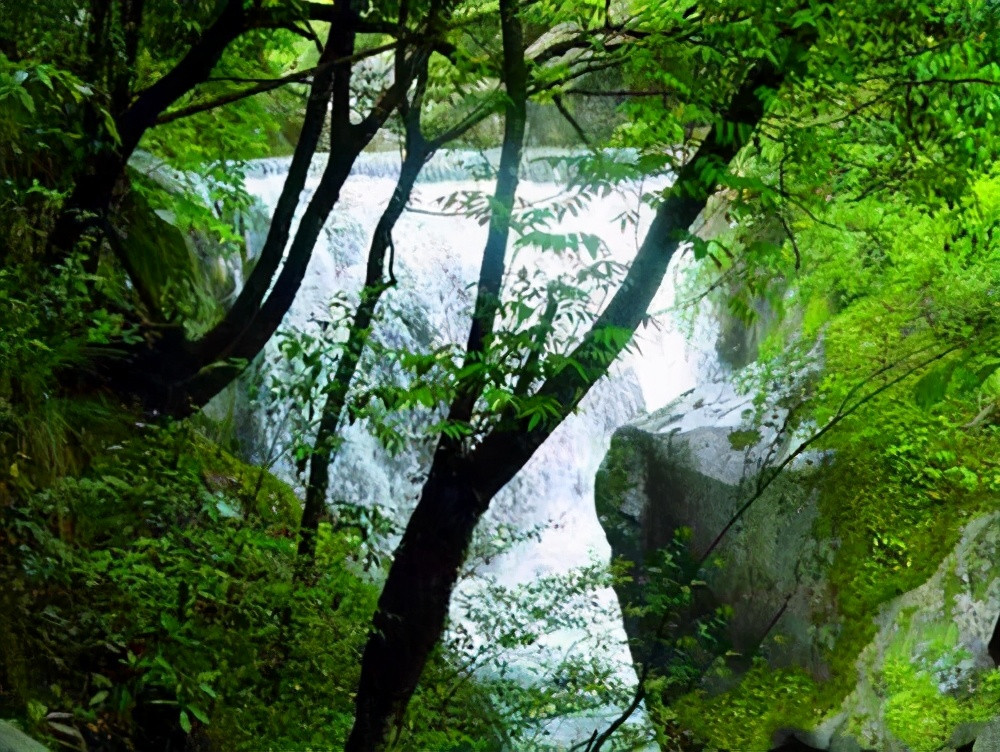 汪湖的原始森林里蕴藏着雷霆千钧的瀑布。沿着林荫下的木栈道前行,沿途始终有娇艳的杜鹃和幽静的竹林相伴。徒步不出十分钟,便闻瀑布的水声轰鸣。栈道尽头,落差200多米、宽70余米的南山瀑布水雾蒸腾,桃花掩映下的山门上写着“南山瀑布”。当地人不无自豪地说,这是“小黄果树”哩!