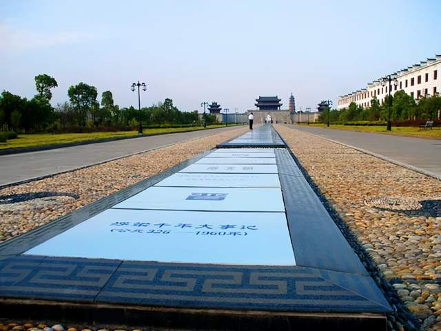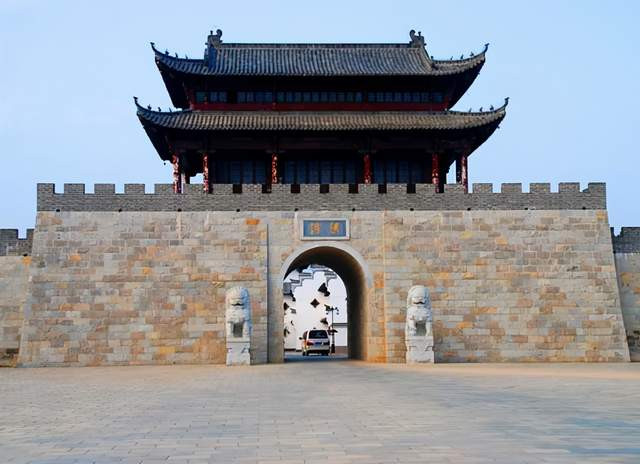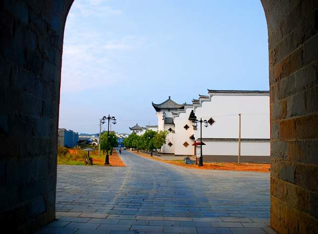 从浮梁文化历史长廊走到头就来到浮梁城楼前。城楼前是一片开阔的广场。广场两面分别为千年瓷坛及哥德堡号景观。走进城楼,是一片正在修建中的徽式建筑群。顺着平坦的甬路走不远就来到浮梁古县衙前。