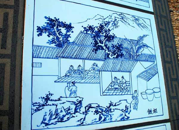 驱车来到浮梁古城前,首先映入游人眼帘的是一座灰色上书“浮梁”二字的石牌坊。走过牌坊,进入了浮梁古城风景区,这时,展现在面前的是一座长达 312米,以贴地瓷砖建造的浮梁历史文化长廊,由216块青花瓷板铺就而成。这是一本史书,让人们得以浏览浮梁千余年厚重的历史文化。