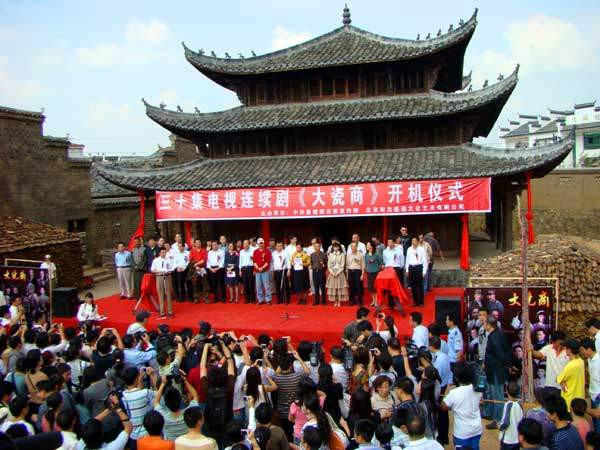 走进天佑御瓷大院,只见院内、院外都晾满了烧窑的土坯,窑内的土窑虽然没有点火,但是烧窑的木柴成垛的堆在窗檐下。院正中临时搭建了一座大舞台,《大瓷商》的开机仪式即将在这里举行。舞台上方一条红底白字的横幅“三十集电视连续剧《大瓷商》开机仪式”异常醒目。舞台前两侧分别是演员阵容的宣传画。