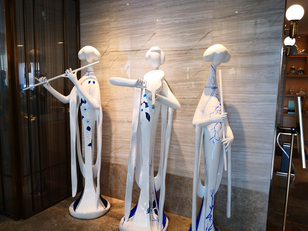 第二天3号,早餐后滴滴叫车出发去古窑民俗博览区,景德镇这几天的市内交通基本都是滴滴解决的,挺方便的。古窑博览区是一个集文化博览、陶瓷体验、娱乐休闲为一体的文化旅游景区,是全国唯一一家以陶瓷文化为主题的国家级5A景区。景区面积很大,门口是窑神童宾的青铜雕塑。我们沿左边道路进去,亭台楼榭,小桥流水,到处是陶瓷的装饰。瓷音水榭是一个表演瓷乐器的舞台,我们看了一场演出,美女乐师们穿着特色鲜明的青花瓷服饰,以团队合奏的形式在水面的厅榭中演奏了“茉莉花”、“土耳其进行曲”等几首曲子,听起来不错,特别是打击乐,有敲打瓷器的特别的韵味。主持人介绍,组成乐团的乐器有瓷笛、瓷瓯、瓷箫、瓷编钟、瓷边罄、瓷管钟、瓷二胡等。