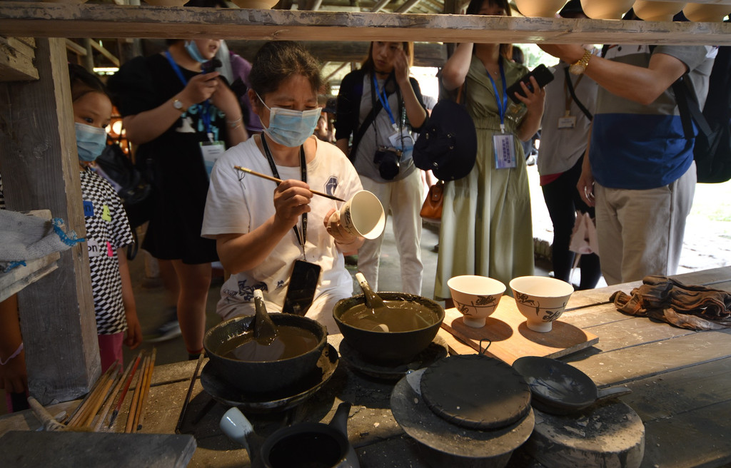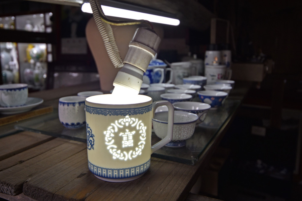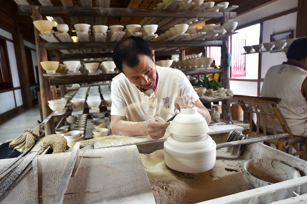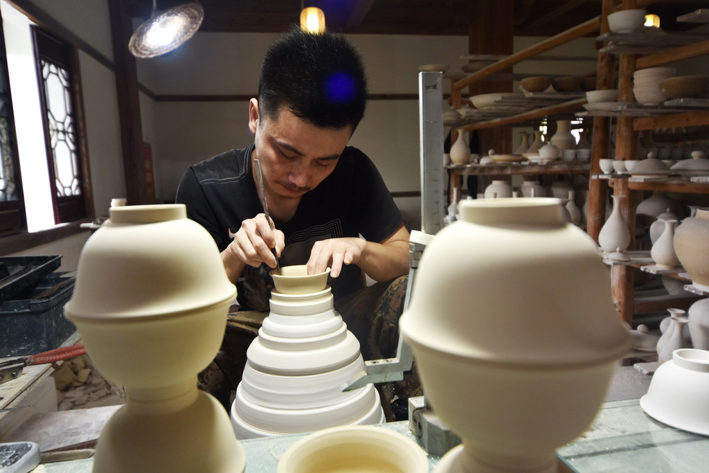 经过“风火仙师”童宾像,我们在手工制瓷作坊停下了脚步。明代宋应星在《天工开物》中这样写道:“共计一坯之力,过手七十二,方克成器。其中微细节目,尚不能尽也。”景德镇制瓷72道工序由此而来。在这里我们看到了传统的制瓷工艺展示,加工好的泥料经过拉坯、 利坯、施釉、画青花等一道道工序渐渐成型,工匠师傅们熟练高超的技艺让我们大开眼界,一块块泥巴在他们手中加工成了一件件精美的艺术品。