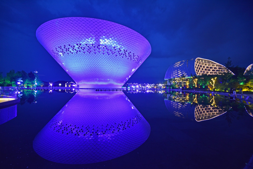 昌南里艺术中心“大碗”的造型灵感来自于宋代湖田窑影青斗笠碗,寓意“万瓷之母”。艺术中心建筑面积约1万平方米,共4层,层高8~10米,中庭采用全挑空结构,设置了3个1000~3000平方米的专业展厅,提供约5500平方米展览空间,为开展销售、展示、培训、创作、拍卖等陶瓷文化活动提供了宽敞优雅的空间。“大碗”外墙采用纳米喷涂铝单板,呈鳞片状叠瓦式布置,通过灯光的投射,“大碗”外面共呈现八种颜色,还可以通过4D技术投影出变幻多样的图案。