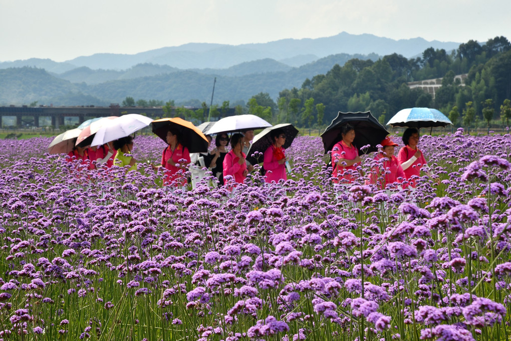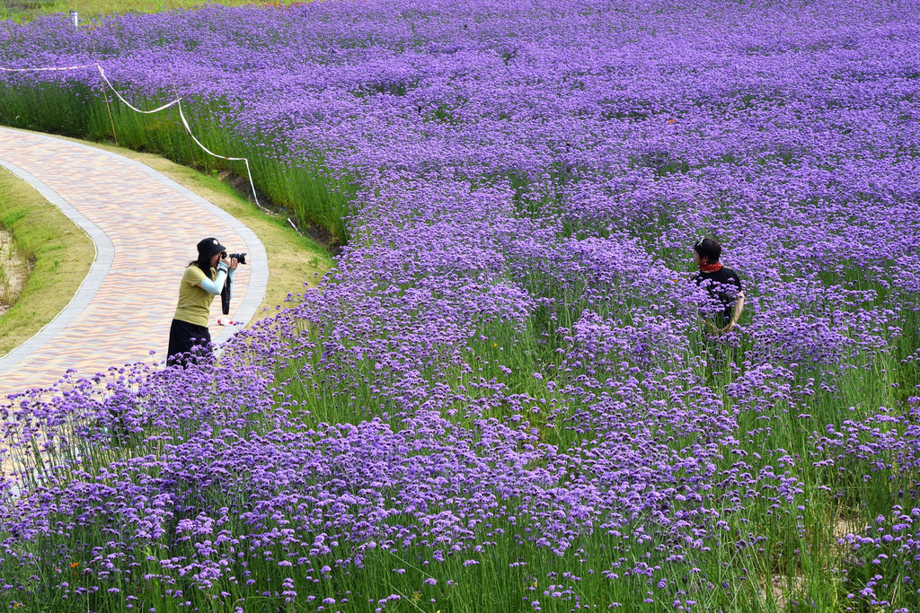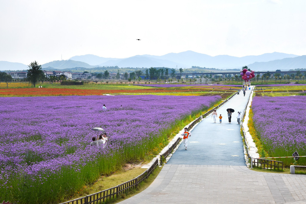 高岭花海由多彩花艺、粉彩花田、颜色釉花谷、青花岭、玲珑花园五个片区组成,种植了几十种不同的花卉,其中紫色的马鞭草成大片规模,是游人最喜欢的拍照取景地。