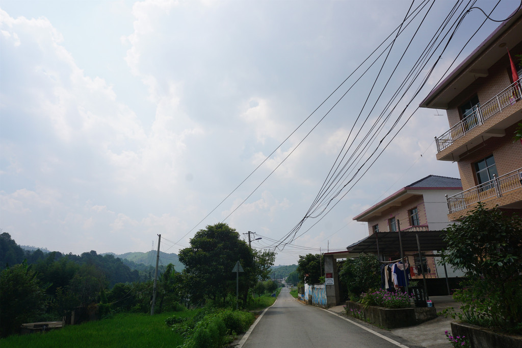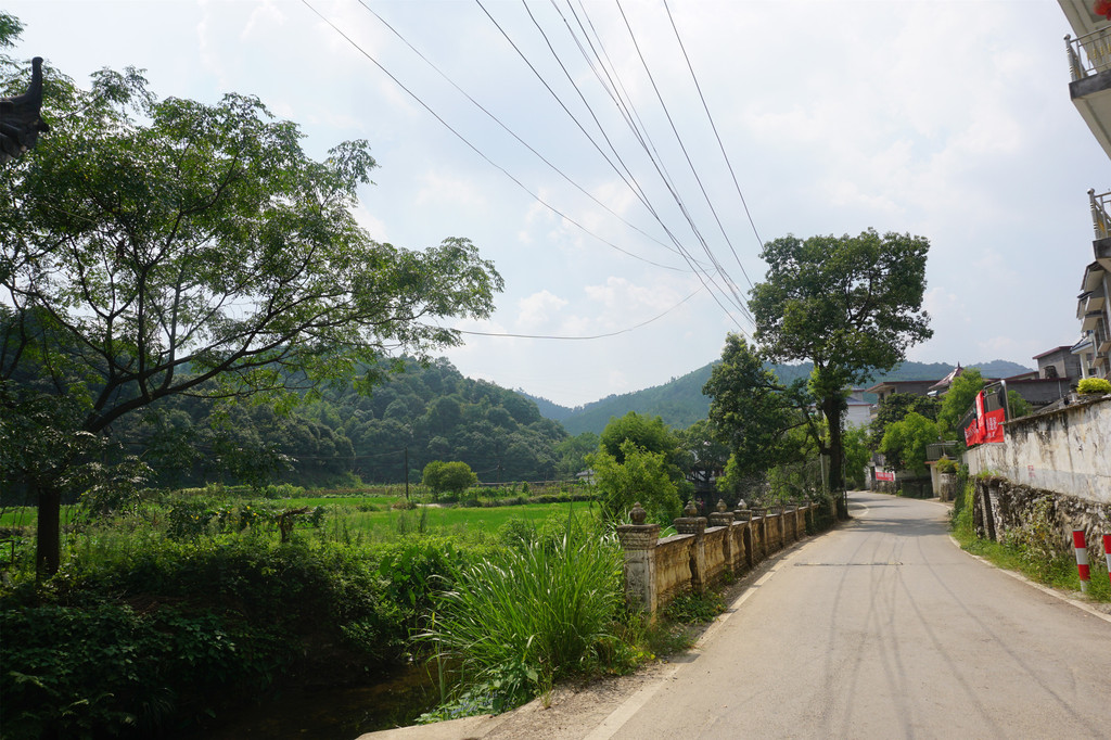 村中主干道,一侧是一栋栋或古老或新式的民宅,一侧是绿油油的稻田。