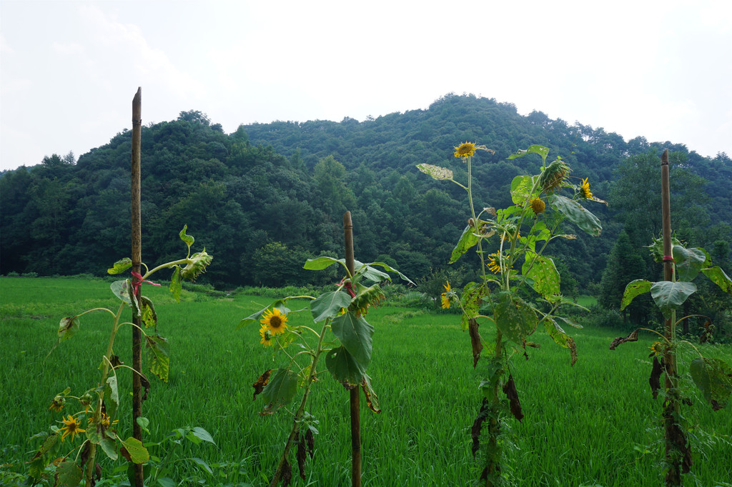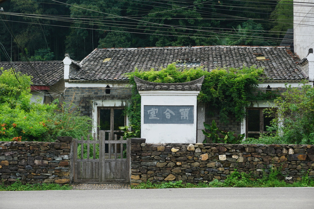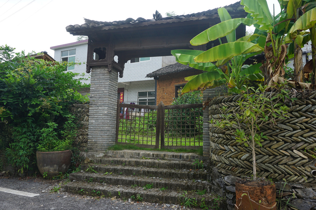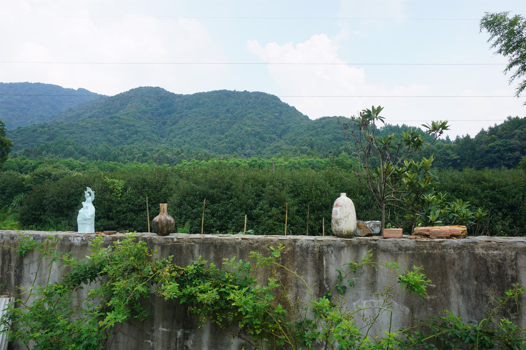 村子最东边是一石头墙院,石墙开敞,不见柴扉。我们信步而入,院落低矮的围墙可以一览乡间美景。院落中的瓶瓶罐罐一看就是很有瓷都景德镇的城市特色。