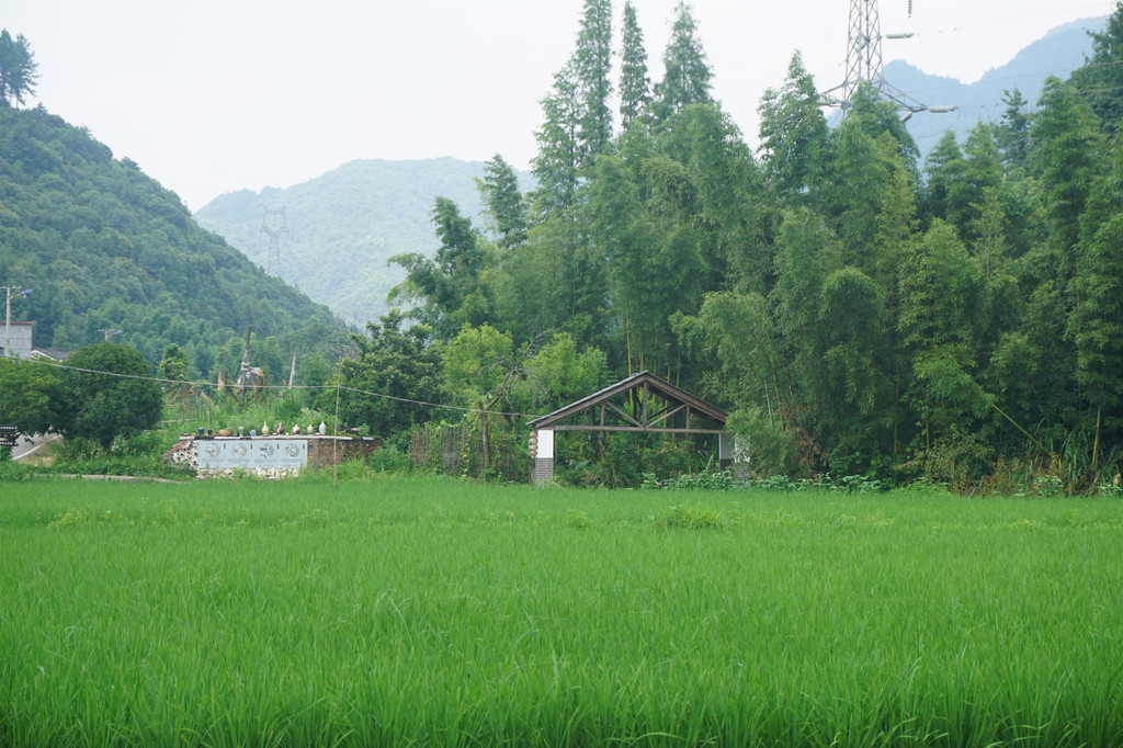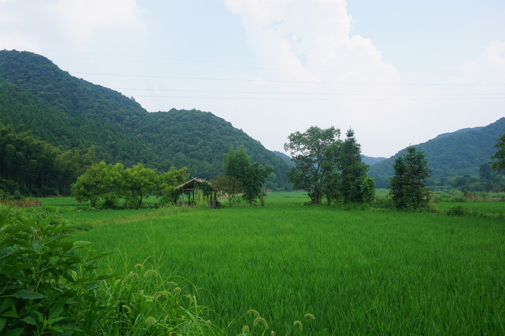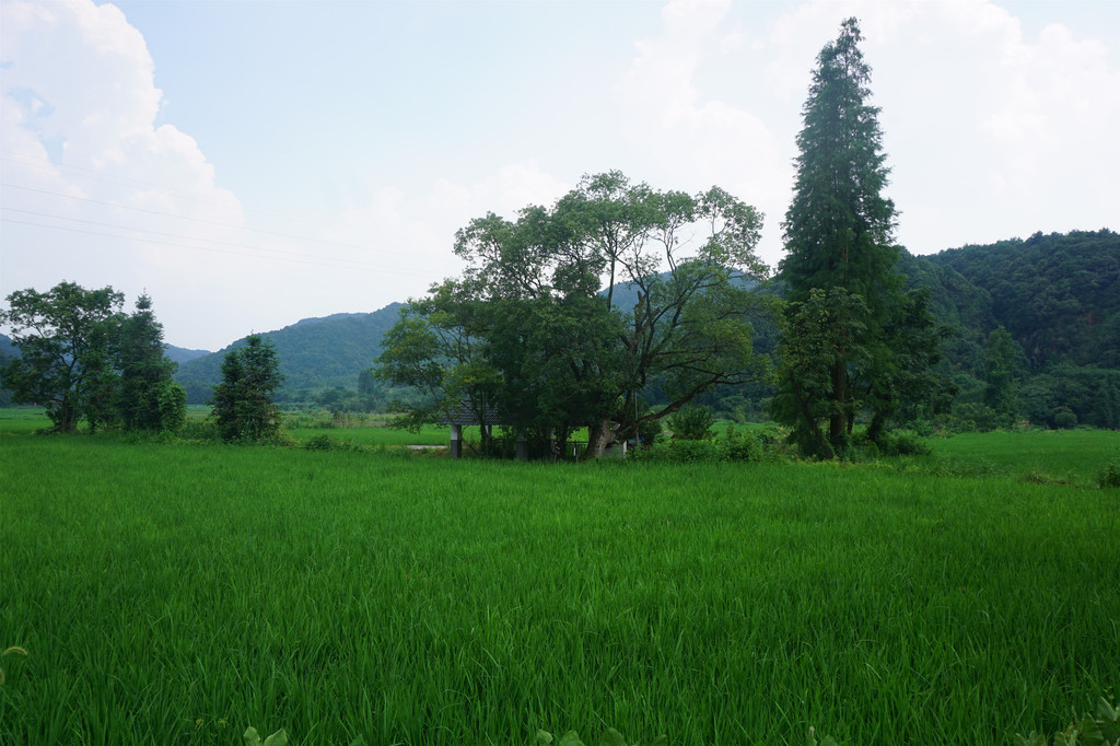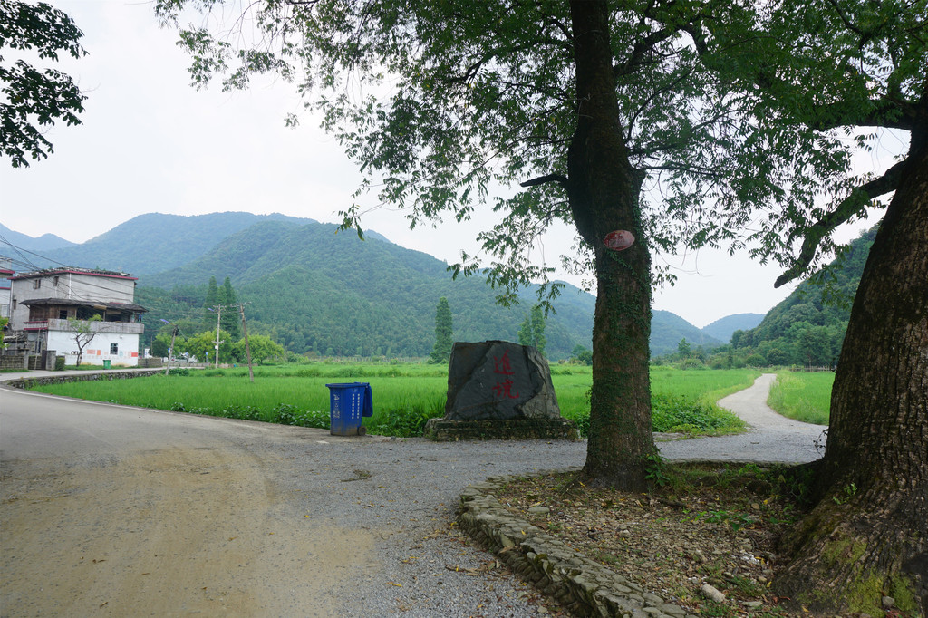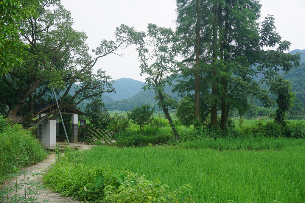 右拐进入村道,驶入山谷中的进坑村。村口几株古树,平坦的村道上一尘不染,两侧连绵起伏的丘陵环抱着良田,绿油油的稻田绿的水灵灵的。