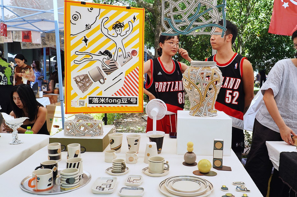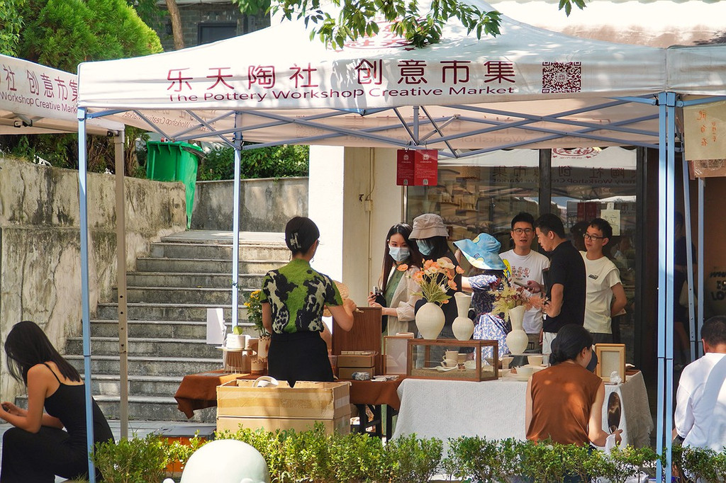 在乐天创意市集,我们看到许多有创意的作品。这里,不论是摆摊的,还是来买的人,都以年轻人居多。他们的穿着打扮,年轻、时尚,是盛夏之风。摊主在介绍自己的作品时,那种眉飞色舞,是意气风发,是朝气。陶溪川的周末晚上,也有年轻学生的作品,同样是这种气息。然而,明清园里的陶瓷就比较老年,规模化生产的日用瓷更常见。价格也是拿来砍价的样子。
