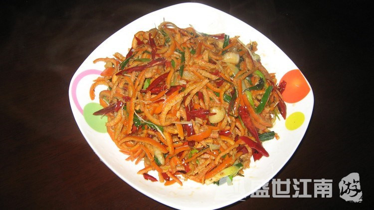 干煸桔皮丝是用干桔皮加上生姜、干椒、花菜芯等煸成,吃起来脆嫩可口,桔香四溢,另外还可以清热去火。