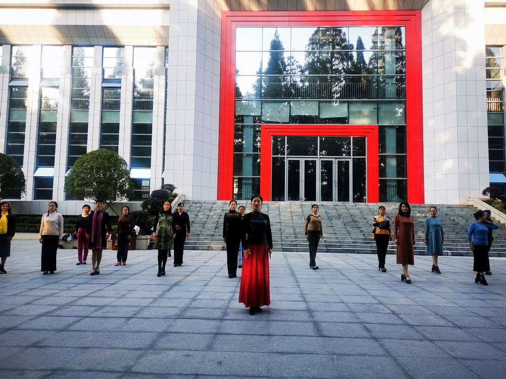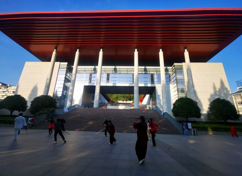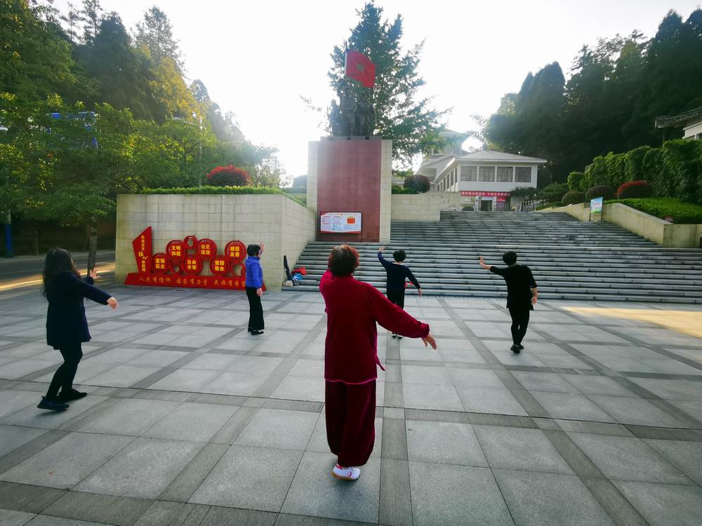 井冈山革命博物馆依山临水,耸立于挹翠湖旁,与茨坪革命旧址群隔湖相望。图为井冈山革命博物馆前晨练的人。