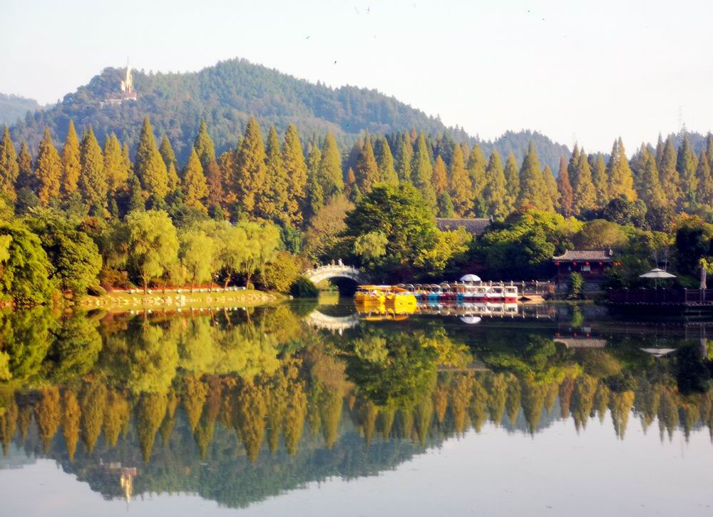茨坪中央是挹翠湖公园,绿荫如盖、湖平如镜、亭台楼阁相映成趣。