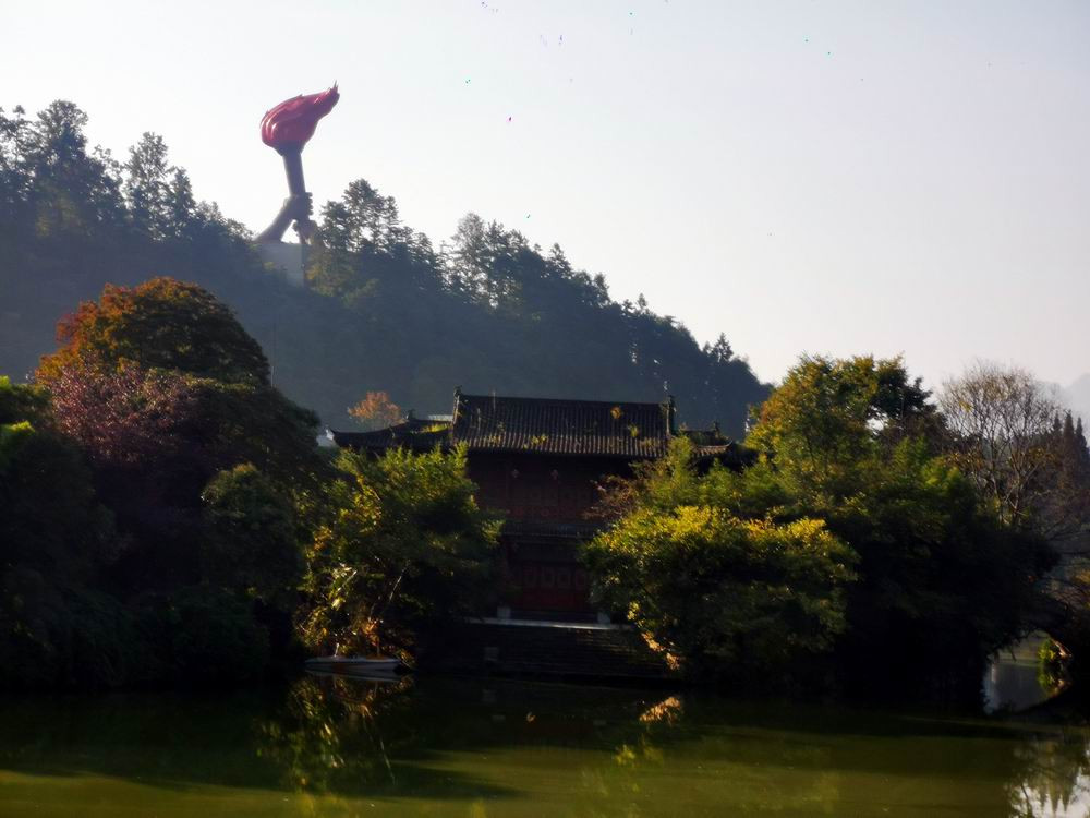 从井冈山的高速公路出口到井冈山市还要爬一段山路。图为远眺井冈山市的一个巨型雕塑。