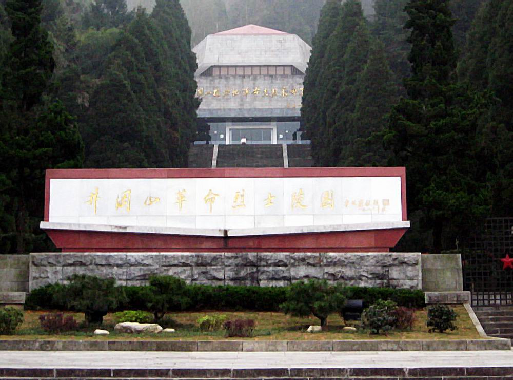 井冈山革命烈士陵园坐北朝南,面对雄伟的井冈山主峰,整座陵园占地面积400亩,四周青松翠柏,庄严肃穆,依山而建,由纪念堂、碑林、纪念碑、雕塑园四部分组成。顺山而上有两组台阶,第一组有49级,象征着1949年新中国成立。第二组有60级,寓意烈士陵园是在井冈山根据地创建六十周年的1987年10月建成的。图为远眺井冈山革命烈士陵园。
