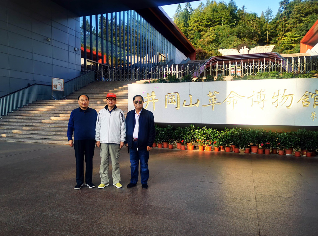 井冈山革命博物馆建筑面积达3065平方米,陈列面积2000余平方米,其中原物860多件,这些文物、图片再现了井冈山斗争的光辉历程,是进行革命传统教育的好课堂。图为我们三位老友在井冈山革命博物馆前的合影。
