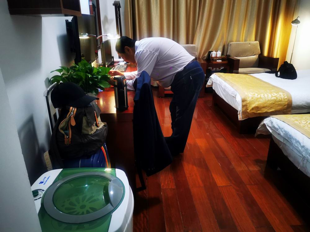井冈山市江轩宾馆的房间很大。这里还是江西省宣传干部的培训中心,因此;每个房间还有洗衣机。