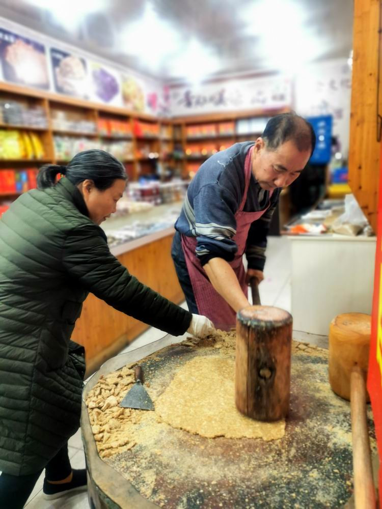 井冈山市我来过多次,由于疫情影响,现在天街的游客少了很多。这是一个店铺的主人在加工食品。