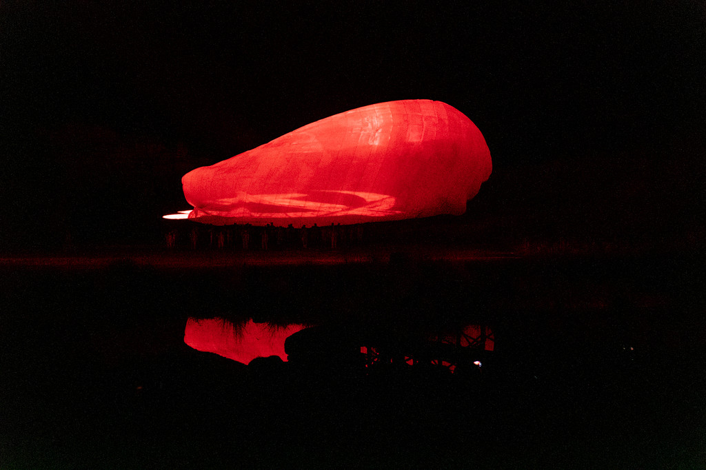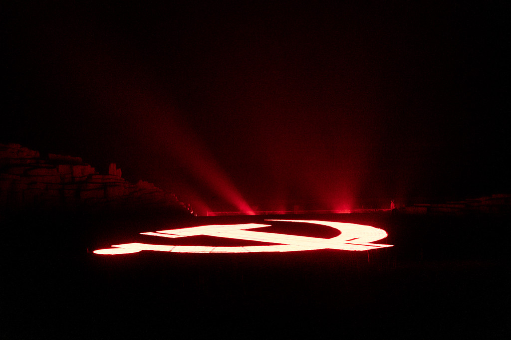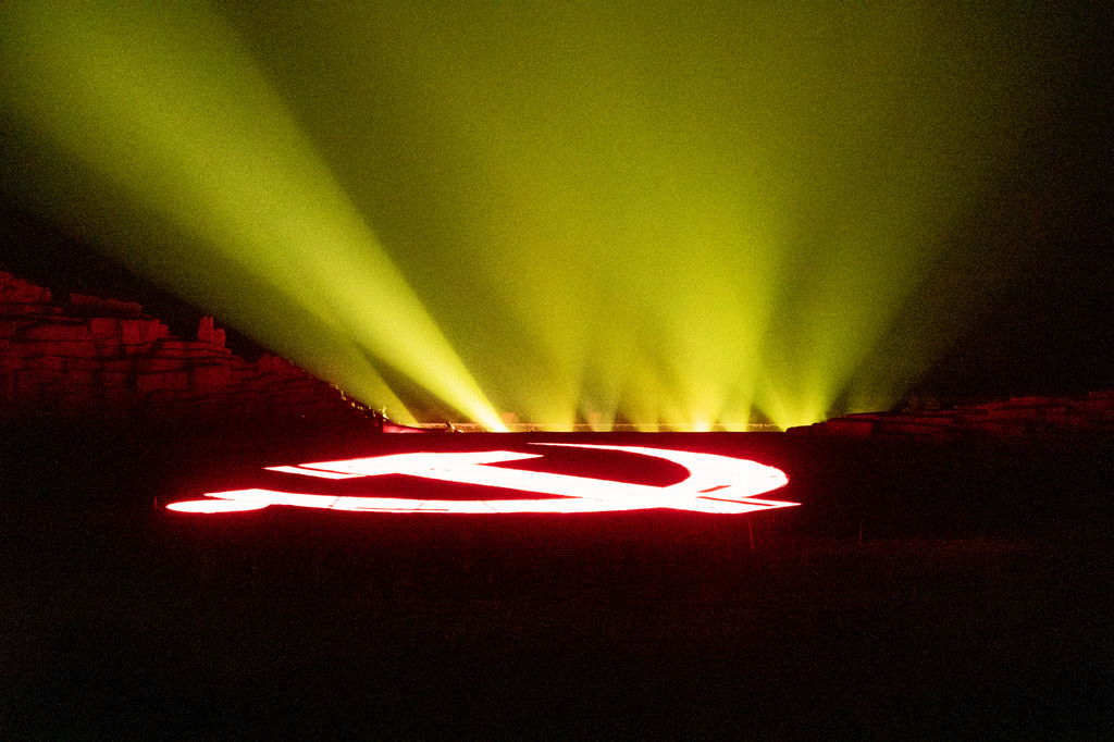 演出场地面积非常大,是一整个的山水剧场,面积达到了10万平方米以上,大概有30个足球场那么大。在演出过程中,有一个非常震撼的场景,那就是使用科技手段打出来的高达4000平方米的党旗了,在这上面还有一个直径达到30米的镰刀斧头。