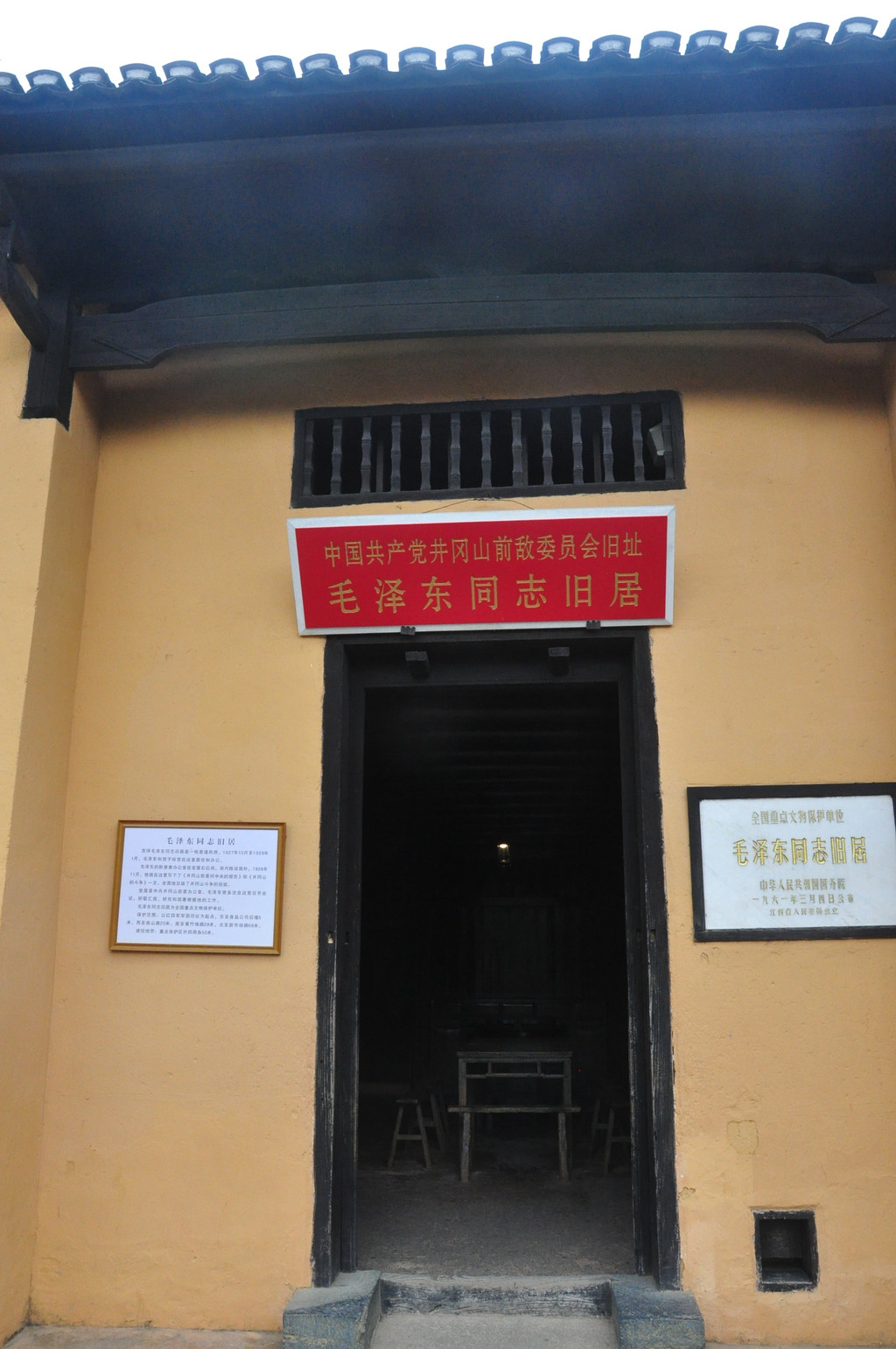 1927年10月至1929年1月,毛泽东同志常住在这栋民房的中厅和右后间。当时红军的生活条件极其艰苦,毛泽东和红军战士一样,穿单衣,睡稻草,晚上点一根灯芯的油灯,写下了《井冈山的斗争》这篇光辉著作。1929年2月,这栋房子被国民党反动派烧毁,1961年由当地政府修复。在毛泽东、朱德同志的旧居里,陈列着他们当年用过的床、草席、桌凳、桐油灯、马灯、地图、砚台和毛笔、箩筐、扁担等用品。当年吃过的红米、南瓜、秋茄子也陈列在堂屋里。 当年中央井冈山前敌委员会及军械处、公卖处、红军被服厂、教导队、湘赣边界防务委员会和红四军军部等旧址,依然保存如故,现已按原貌修复一新,并于1983年10月在朱德同志旧居旁修复了彭德怀、陈毅同志的当年住所,两人曾经用过的物品均陈列房内。泪。