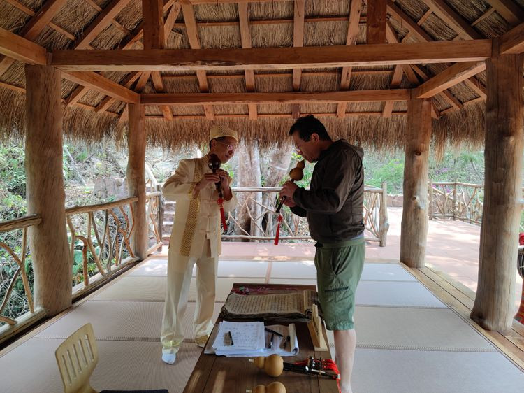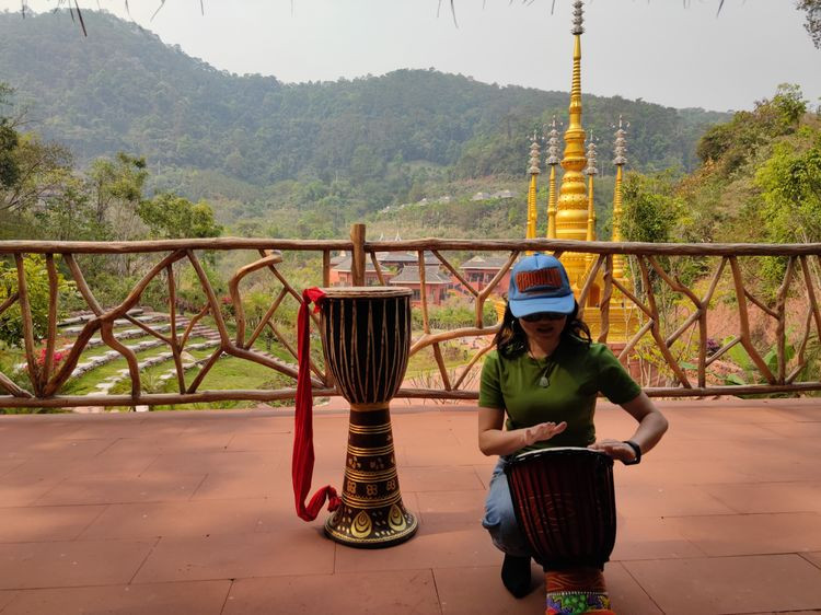 在多才多艺的岩宝老师带领下,我们学习敲象脚鼓、跳傣族舞,大家围成一圈,踩着鼓点、跟着老师一起跳孔雀舞。