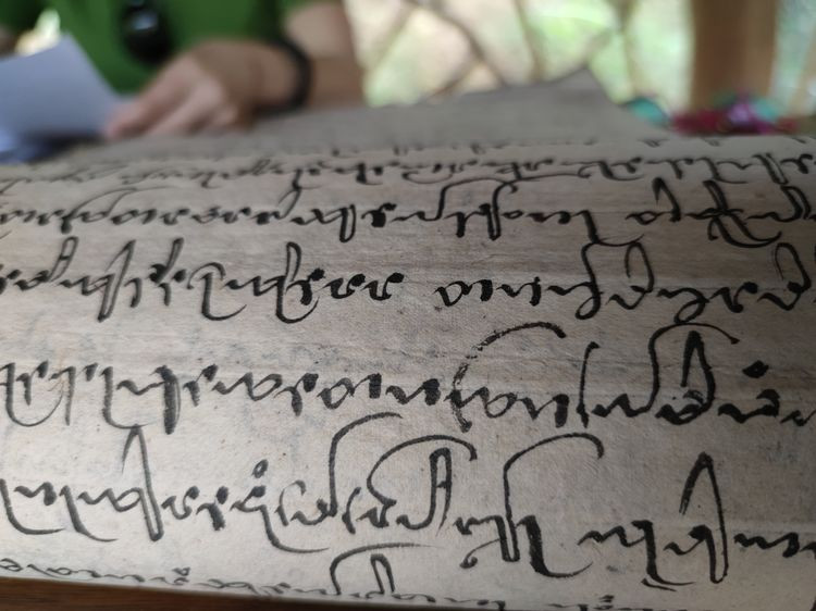 在大金塔旁的云舍书房有不少记录傣族文化的书籍,有数百年历史的傣文手抄本,那是手写在蚕丝书卷上的古老傣文,据说是一些傣族民间故事的记录。