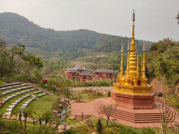 建筑物造型都是傣族建筑风格,橙红色墙面、金孔雀雕塑,有一种吉祥如意的祝福。