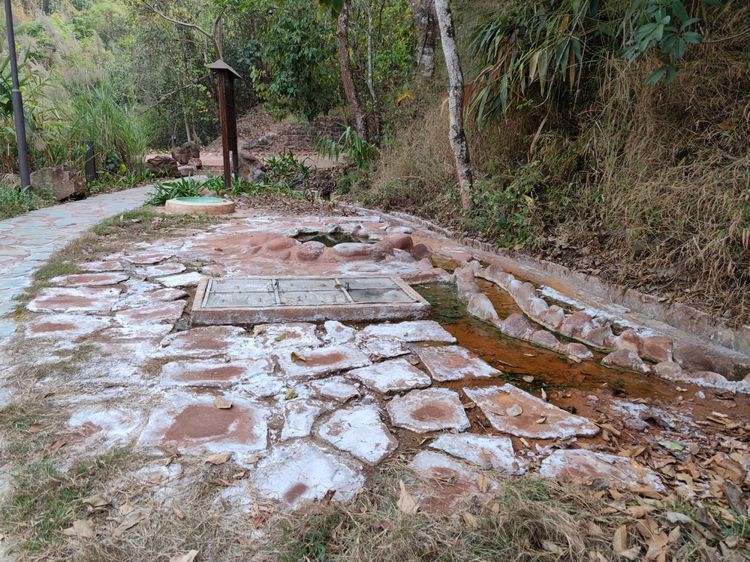 与其他地方温泉最大的区别是,这里的热泉含盐分高、咸味十足,泉眼周边、水流过的河道旁,都有白色的氯化钠结晶析出,与深绿色的青苔相配,很是醒目、很是特别。