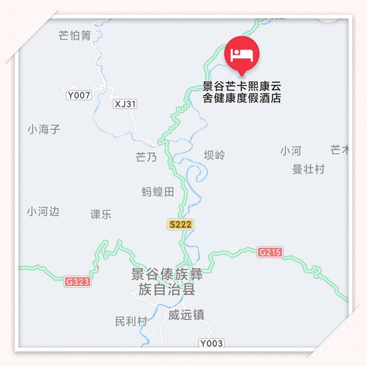 景谷芒卡熙康云舍健康度假酒店位于景谷县城北部,距离县城16公里左右,位于G215国道旁,交通很便捷。