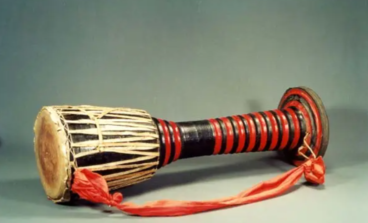 象脚是傣族最典型、最古老的乐器之一,因其鼓身似象脚而得名,广泛用于歌舞和傣戏伴奏中。其形状上粗下细,呈喇叭状,奇特的造型令鼓声产生一种绝妙的共鸣,如春雷滚滚,余音悠长,经久不散。关于象脚鼓的来源,在傣族民间流传着一个非常有趣的故事:古时因为一条蛟龙作恶,傣族地区年年洪水为患。后来,一个勇敢的傣族青年在村民的帮助下成功杀死了蛟龙。人们剥下蛟龙皮,仿照象征吉祥如意的白象的脚,做成了象脚鼓。从此,象脚鼓的咚咚声响彻傣家村寨,欢快的节奏表达出了傣族人民的喜悦心情,更寓意着他们对美好生活的憧憬向往。