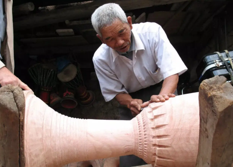 景谷的象脚鼓技艺十分出名,其制作过程复杂,需要用整根木头擂出鼓身,再用牛皮手工做成鼓面,并用纯天然的颜料画上精美的彩绘,所有流程一气呵成。一只象脚鼓从选树到制成大约需要3—4个月时间,一般用椿树、杨柳树、云槐树、刺通树、攀枝花树、牛嗓管树等树木作为制作原料,现在大多选用芒果树。因景谷素有“芒果之乡”的美誉,用芒果树干做出的景谷象脚鼓赋予了鼓更为丰满的寓意。过程中需要经过内部镂空打磨、外部凿刻打磨、纹路雕刻、蒙制鼓面、彩绘装饰等30道工序,方能制作出一只音质、音色上佳的象脚鼓。目前,象脚鼓的制作技艺已被列入普洱市第五批非物质文化遗产保护名录,这中间无不蕴藏着手艺人的匠心、坚守和传承。