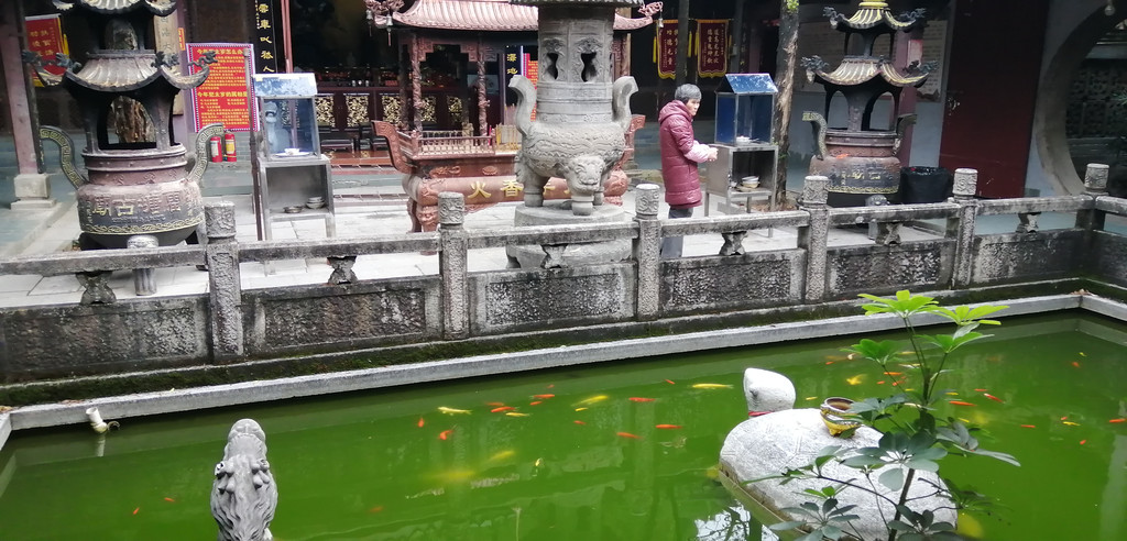 在泉眼的中央,有一小岛,岛上一小小的龙王庙,四周的水呈现出洋绿的颜色,水是透明的,只因光线折射的效果,看上去是那么舒心的绿,水中的鱼成群结队,放佛悬浮在空气里一般,微微晃动,柳宗元在小石潭记中写到:“潭中鱼可百许头,皆若空游无所依,日光下澈,影布石上。佁然不动,俶尔远逝,往来翕忽。似与游者相乐。”,似乎挪到此处形容这样的光景也完全相似。
