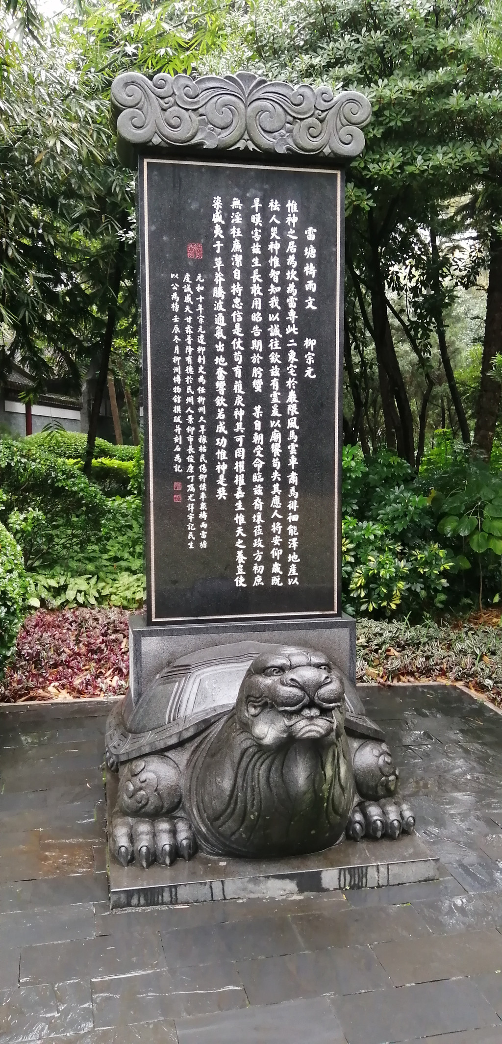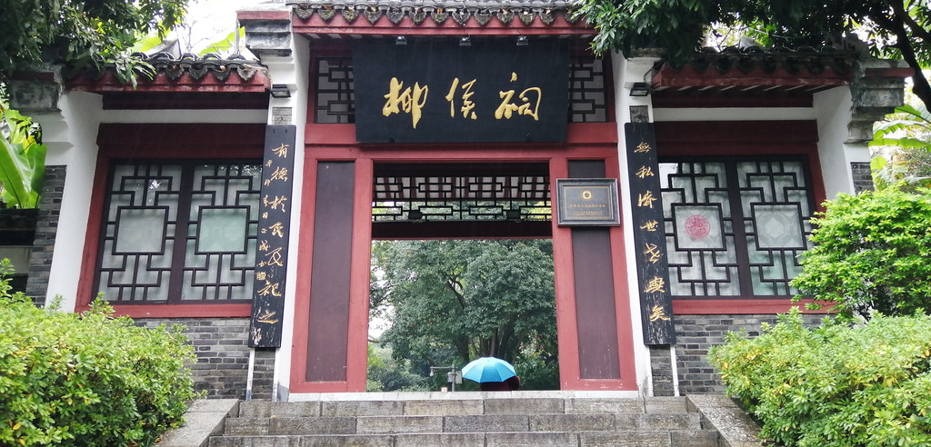 原本想登上马鞍山俯瞰一下柳州的全景,雨继续在下,雾色更加浓郁,于是便放弃了这个念头,乘一路公交去柳侯公园了,柳侯是指唐代著名的散文家、诗人柳宗元了,记得中学里学过其文章——黔之驴,捕蛇者说,当然“千山鸟飞绝,万径人踪灭。孤舟蓑笠翁,独钓寒江雪。”这首诗也很有名,其它似乎已经淡化了,但用这么大一座公园来纪念他,说明柳宗元在为官的时候,肯定为百姓做过许多好事,才赢得了大家的思念与赞美,这当然是值得敬重的,并不单单是文学上的成就,其实白居易、苏东坡、还有更多的历史名人,又何不如此呢?