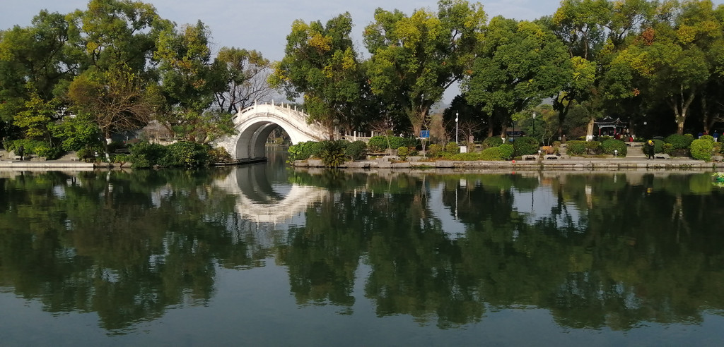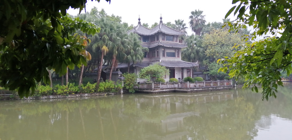 过了文昌大桥,回到南岸,左手边有一座小山,走近,山下有一座公园,那是架鹤山公园,山脚下有一书院,也以架鹤命名,也有溶洞和上山的道,有池塘,有歌台,游人极少,绕着池塘走一圈,到书院的对岸,再看那景致,宛若世外桃源般幽静和优美。