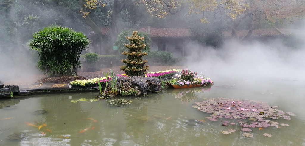 在柳侯公园的西北角,有一座迷你的园中园——中华园,里面假山盆景,曲桥亭台,布置精巧,移步换景。还配上了人工的烟幕,若隐若现间,宛若步入仙境一般。