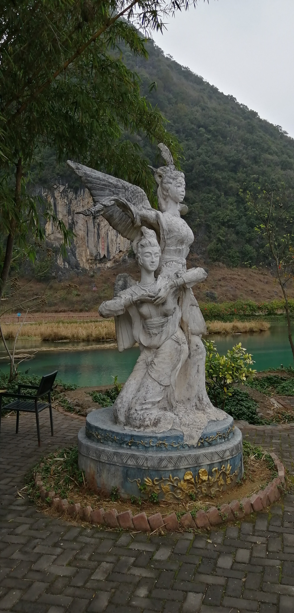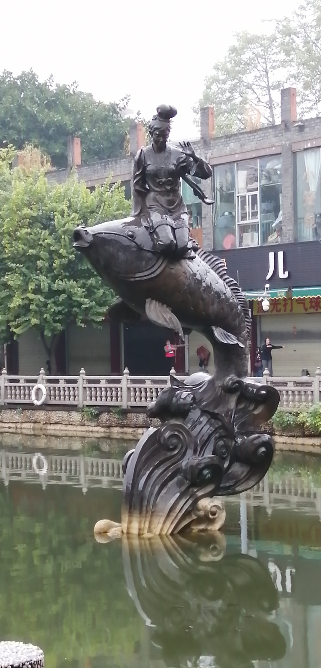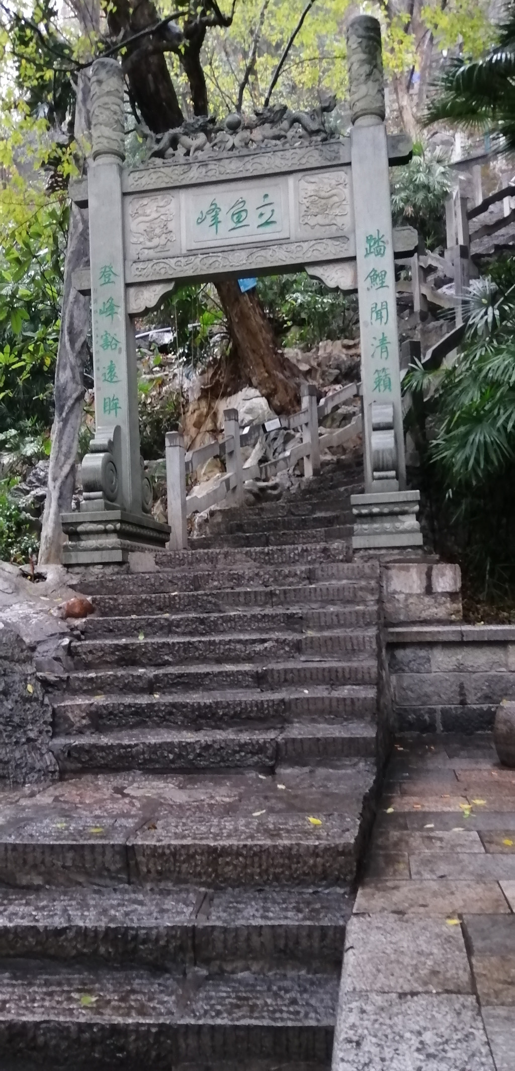 柳州的第二天,下起了密密的细雨,从下榻的宾馆横穿过马路,便来到了立鱼峰公园,立鱼峰是因为形状酷似一条跳立起水面的鲤鱼而得名,旁边有一小湖,名曰灵泉,正对着泉亭,后面还有一座古刹,古刹的后面是一座形似马鞍的山峰,比立鱼峰更高一些,两个山峰间,架起了缆车,从低处往高处望,那天因为细雨而云雾绕绕,宛若通向仙境一般,泉边还有刘三姐故居一座,对歌台一亭,湖边的泉亭旁,有一雕塑,是刘三姐骑上跳出水面的鲤鱼,升上了天空,成为歌仙……传说总是美丽的,也为景色增添着美丽。