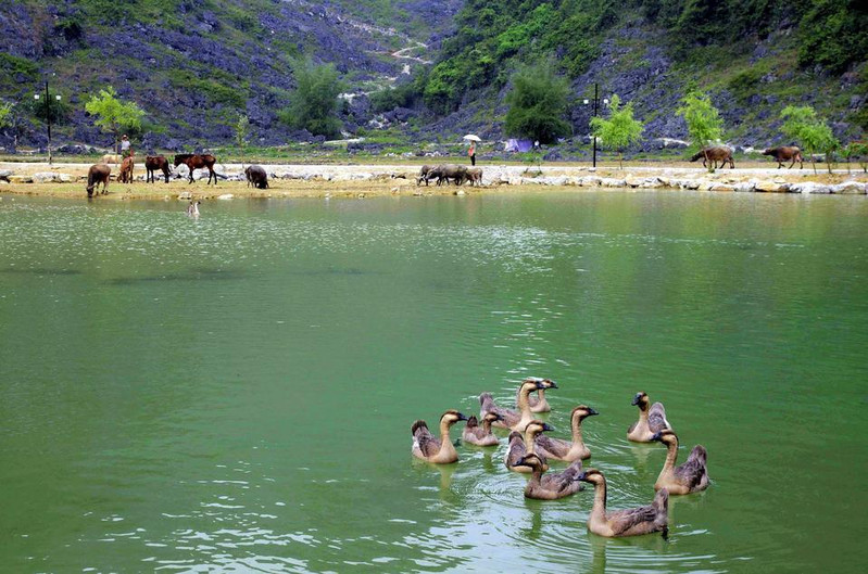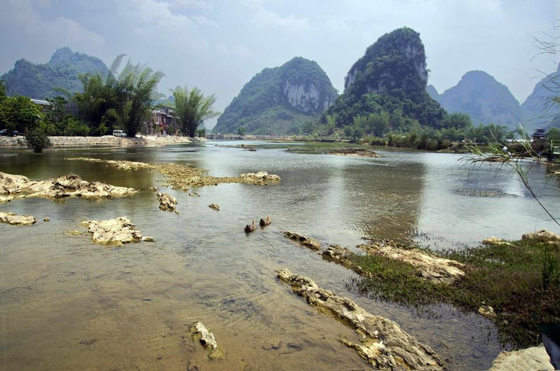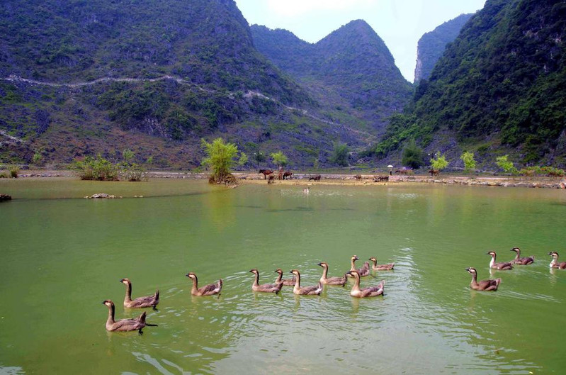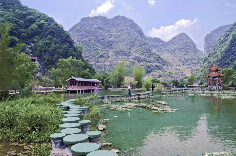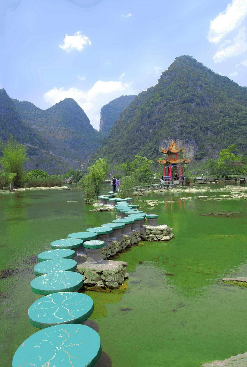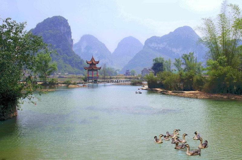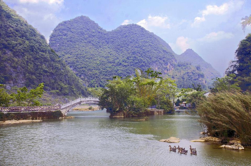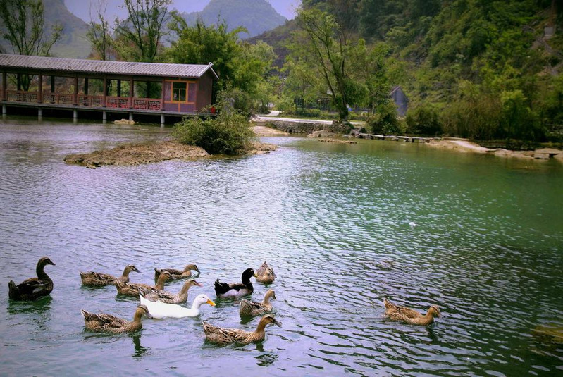 水上步道红栏绮阁,高树攀飞檐,莺歌脆,花气浓,芳草映碧阶,轻柳舞池涟,满目春色迎客来!浅滩云影鹅泉风景区因鹅山像一只鹅躺在泉水之上,故名。现有主要景点有鹅泉跃鲤、古桥,岜搭书、叫喊岩等。水中鸭群鹅泉跃鲤位于鹅泉风景区中心,俗称念安,相传古时念安屯有—个名叫杨媪的老人。偶于路边拾得鹅蛋两只,等了许久没人来领,带回家用体温孵出小鹅精心护养,一天放牧于池塘,骤然风雨大作,池塘陷为大深泉,小鹅不知去向。老婆婆因忧郁而死去,后为小鹅收葬,因名鹅泉。人们为了感谢杨媪养鹅造泉之功,在潭中小岛上立庙,并把农历三月三定为鹅泉诞,自明代以来,三月三这一天,文武官员,平民百姓都来到潭边大修禊事,以祝丰年,人们还把米饭撒入潭中,群鱼拥来争食,激起阵阵浪花,故民间留下“鹅泉跃鲤三层浪”之说。凭栏挹春风,意气逐白云,望远处,燕飞来,千山绿如染,水上日撒金,望不尽,春霞如画情如海。水光山色回到遥远的地方,去寻找漂落在那里的梦,朝露一样清甜,牛乳一样新鲜。林木葱茏旅游攻略导航