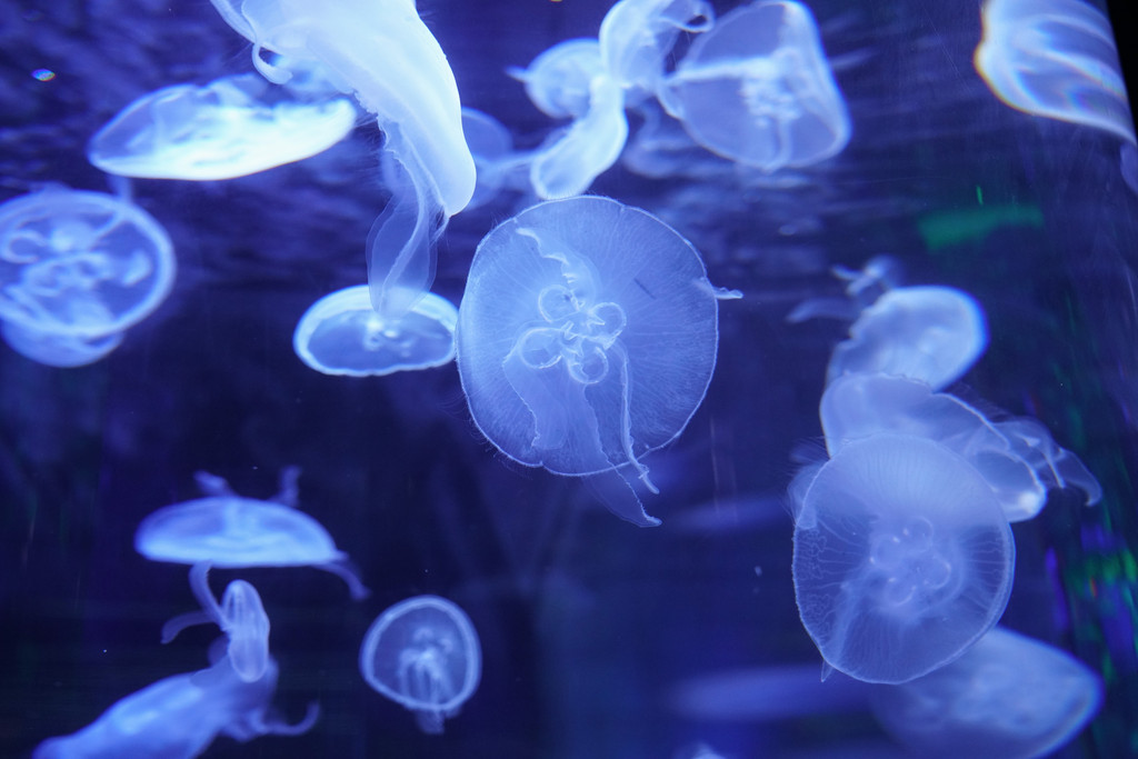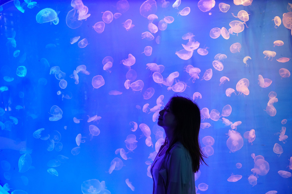 找一片好看的水母展示区当背景,等灯光变换好看的颜色时,拍下剪影照。