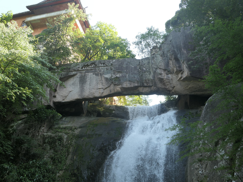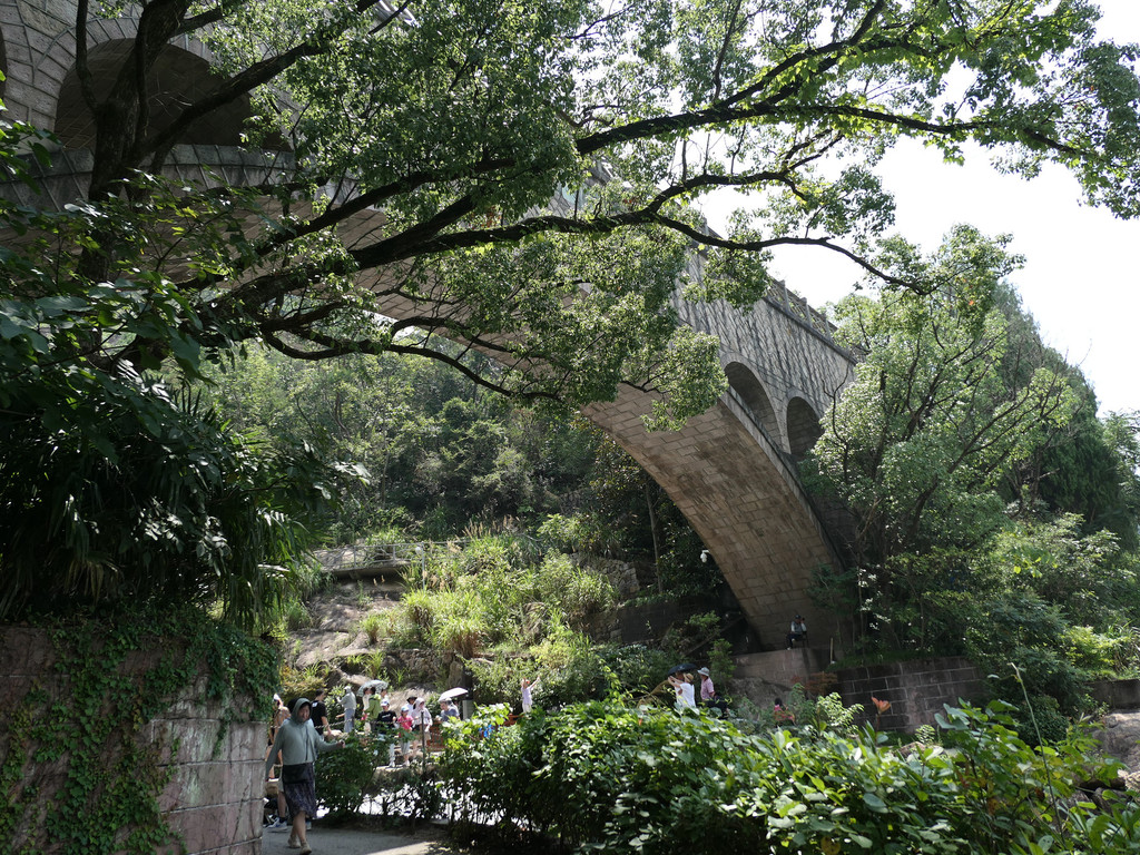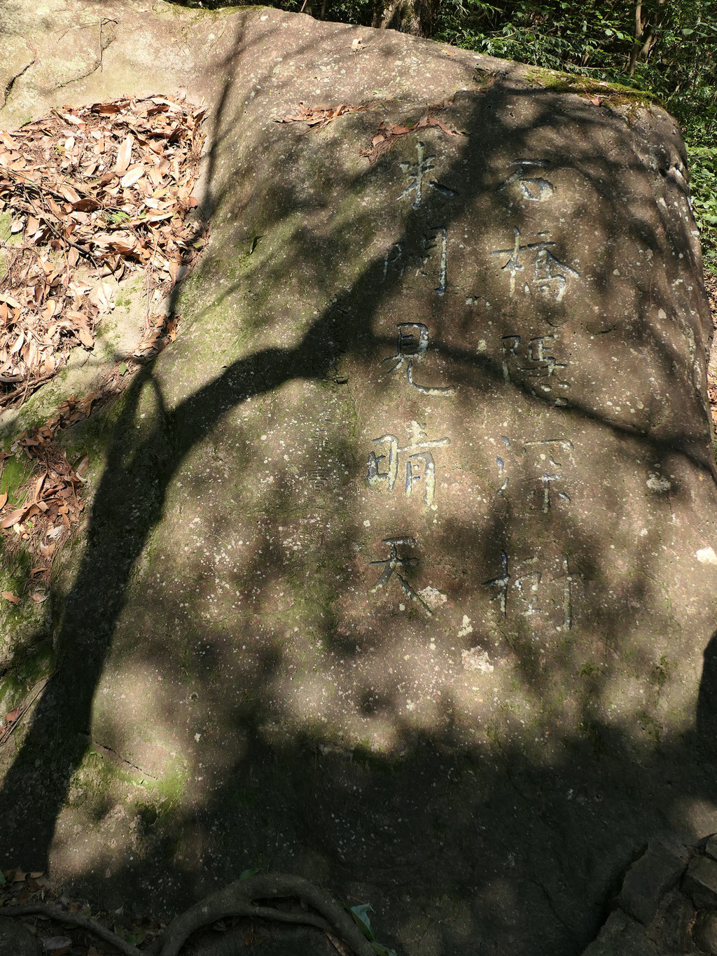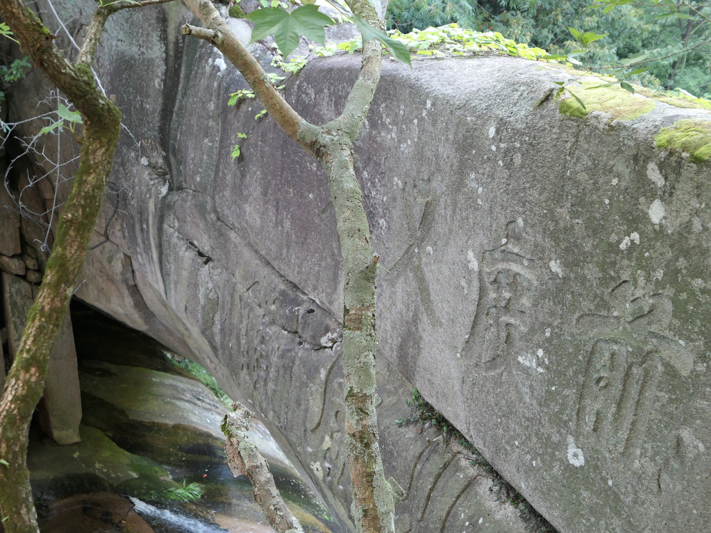石梁腹部刻有两排字“前度又来”、“万山关键”。这八个字因为镌刻时间久远不是很清晰,我拍了半天,只能这样了。“前度又来”为清末台州知府刘璈所书,取刘禹锡“前度刘郎今又来”之意,说明自己是第二次游天台观石梁飞瀑;“万山关键”是清末书法家曹抡选的篆书,表示这里是群山的关键险要之处。曹抡选是天台人,明天在国清寺内王羲之“独笔鹅字碑”还会看到他补写的“半边鹅”。