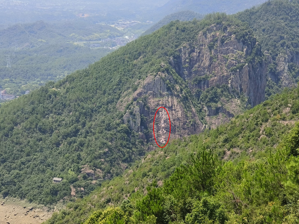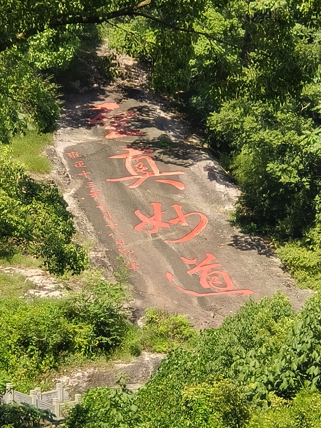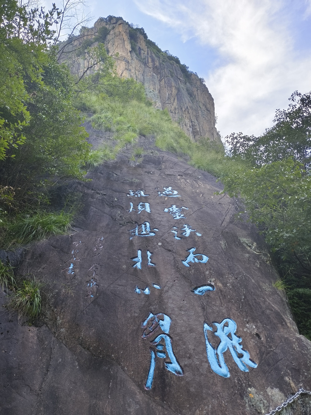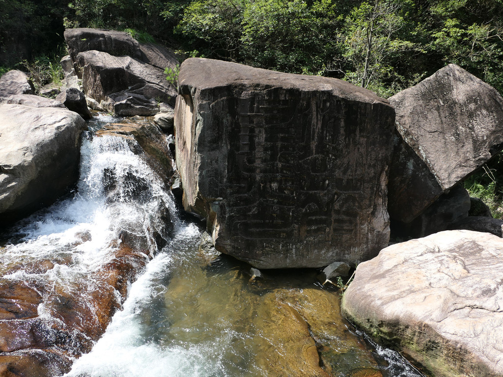 石梁腹部刻有两排字“前度又来”、“万山关键”。这八个字因为镌刻时间久远不是很清晰,我拍了半天,只能这样了。“前度又来”为清末台州知府刘璈所书,取刘禹锡“前度刘郎今又来”之意,说明自己是第二次游天台观石梁飞瀑;“万山关键”是清末书法家曹抡选的篆书,表示这里是群山的关键险要之处。曹抡选是天台人,明天在国清寺内王羲之“独笔鹅字碑”还会看到他补写的“半边鹅”。