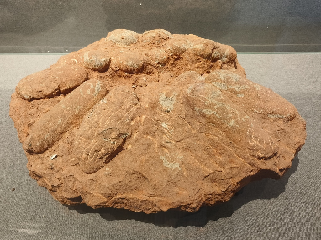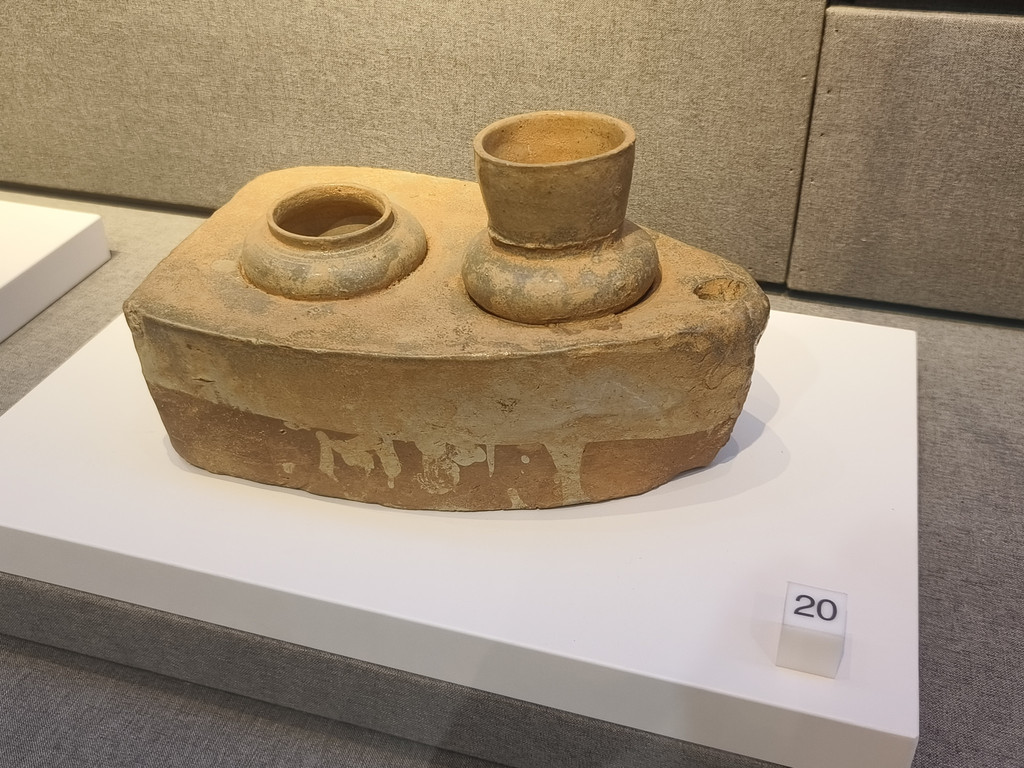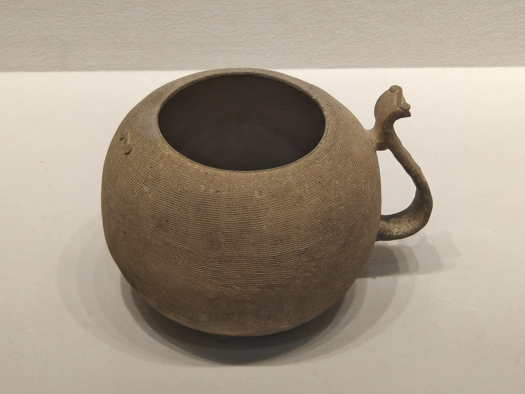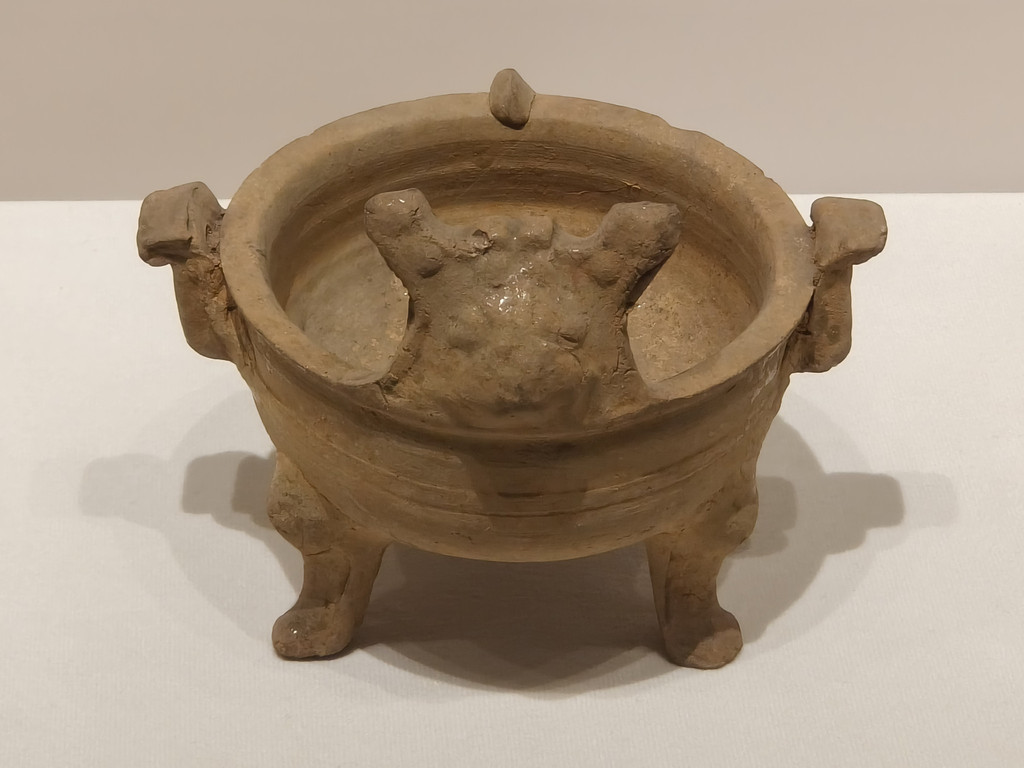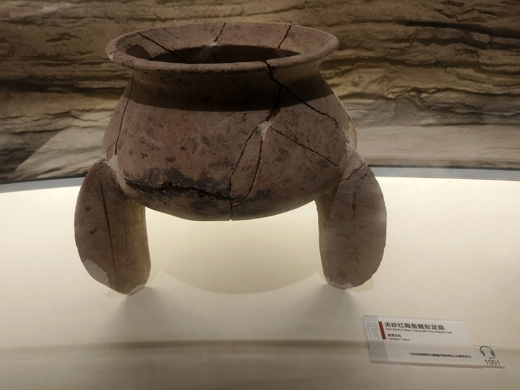 夹砂红陶鱼鳍形足鼎(良渚文化)。炊具,用耐高温的夹砂红陶制成,足呈鱼鳍形。