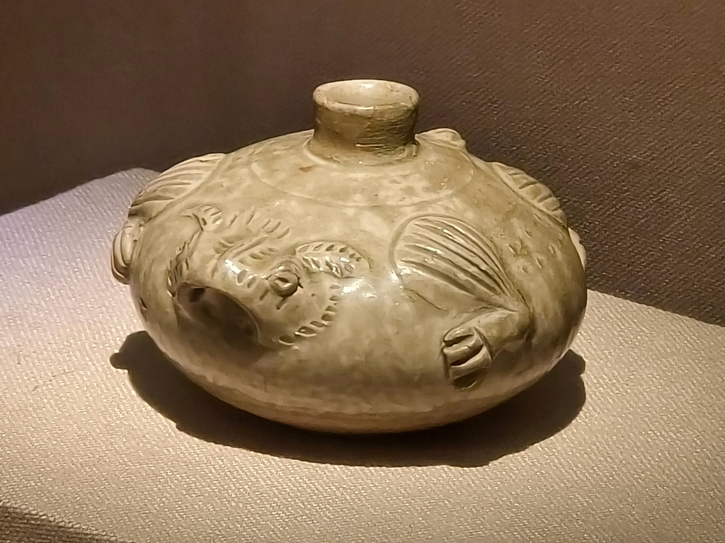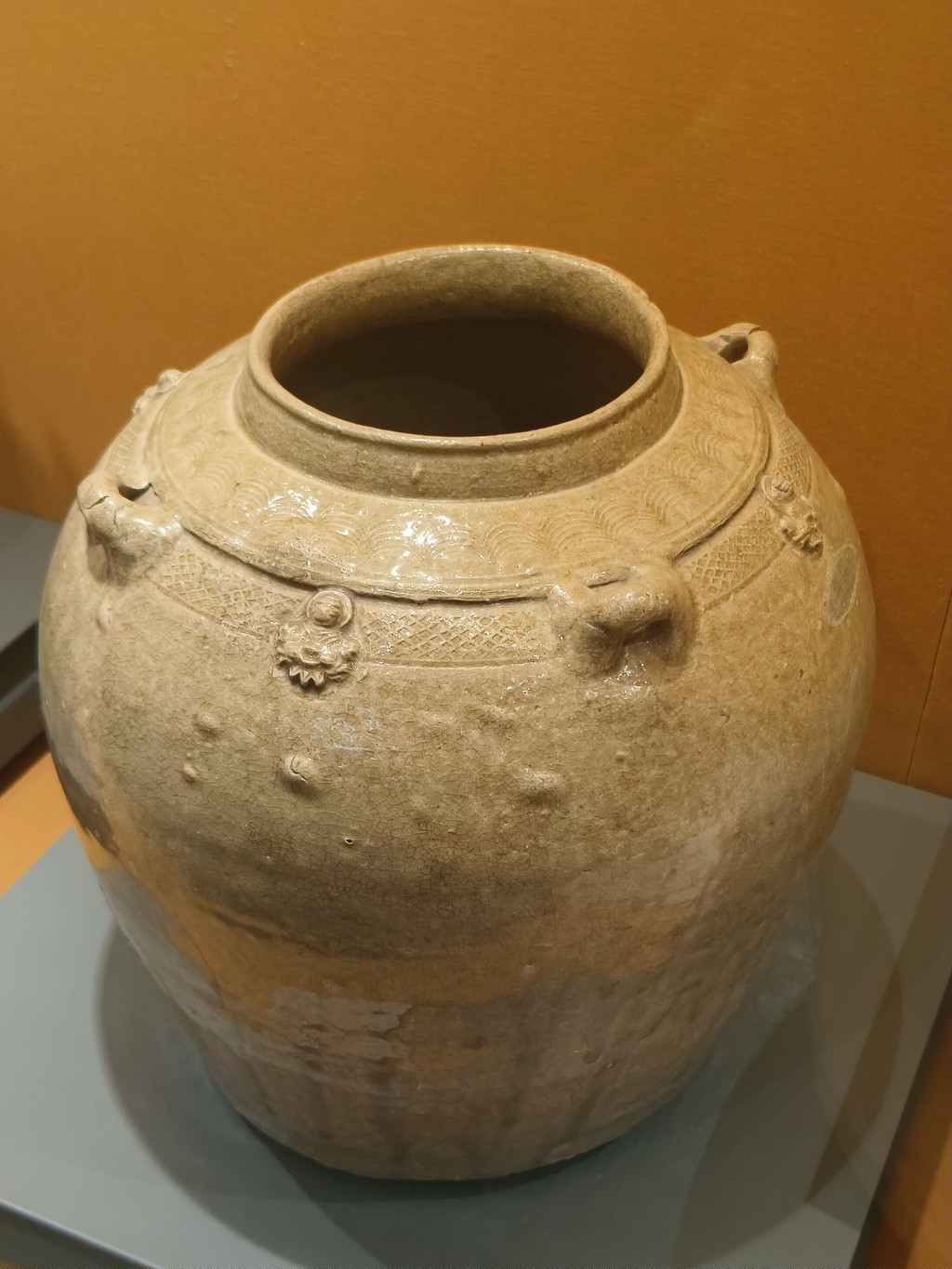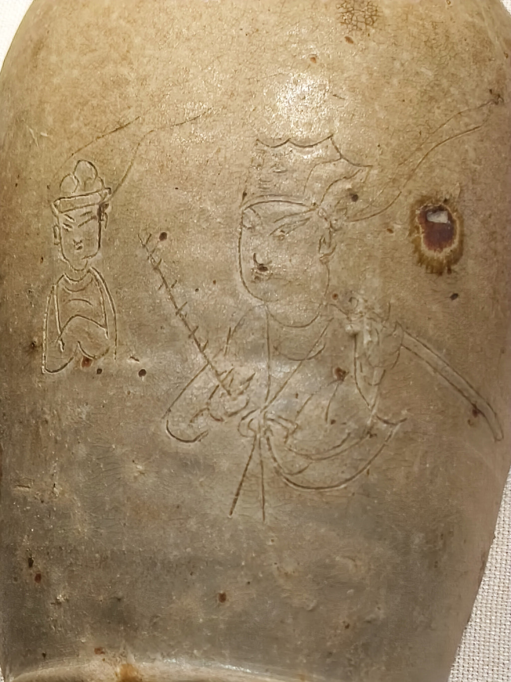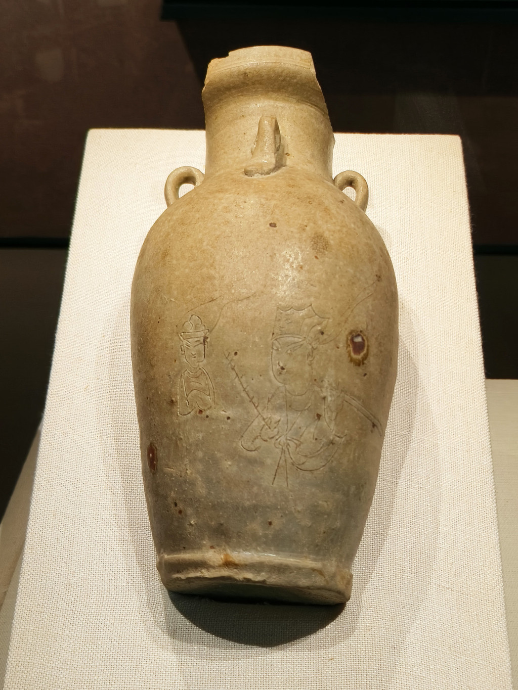 “上虞窑”青釉瓷四鋬罂(北宋)。四鋬(pàn)罂又称粮罂瓶,是一种盛器,由盘口壶发展而来。器腹有铭文“上虞窑匠人项霸造粮婴(罂)瓶一个献上新化亡灵王七斤咸平六年七月廿日记”。