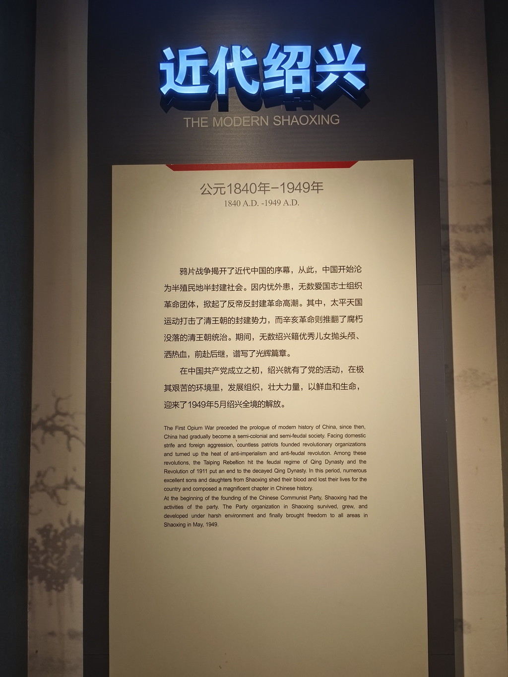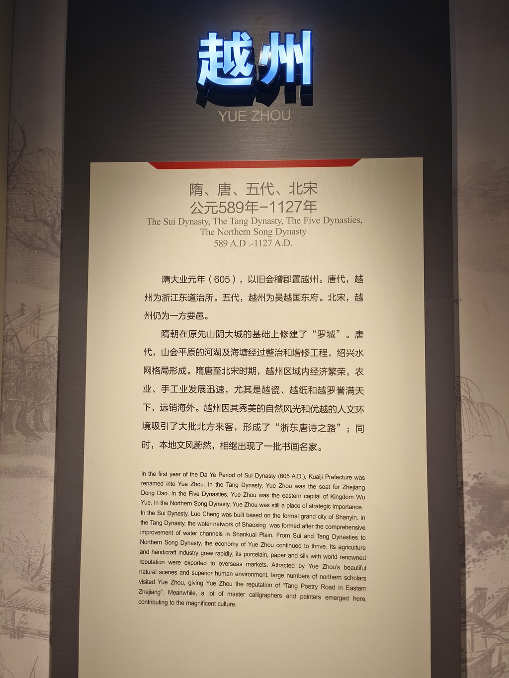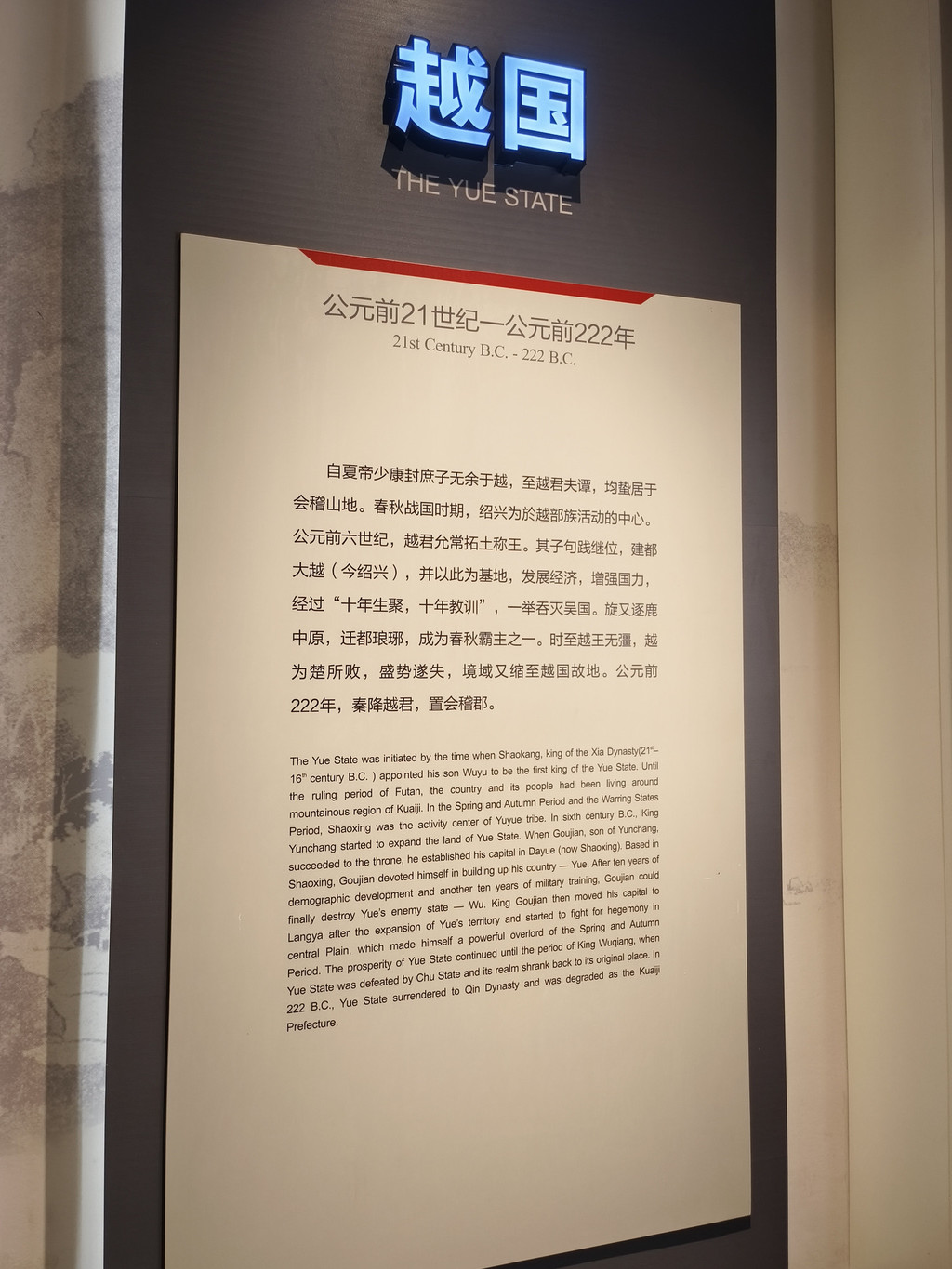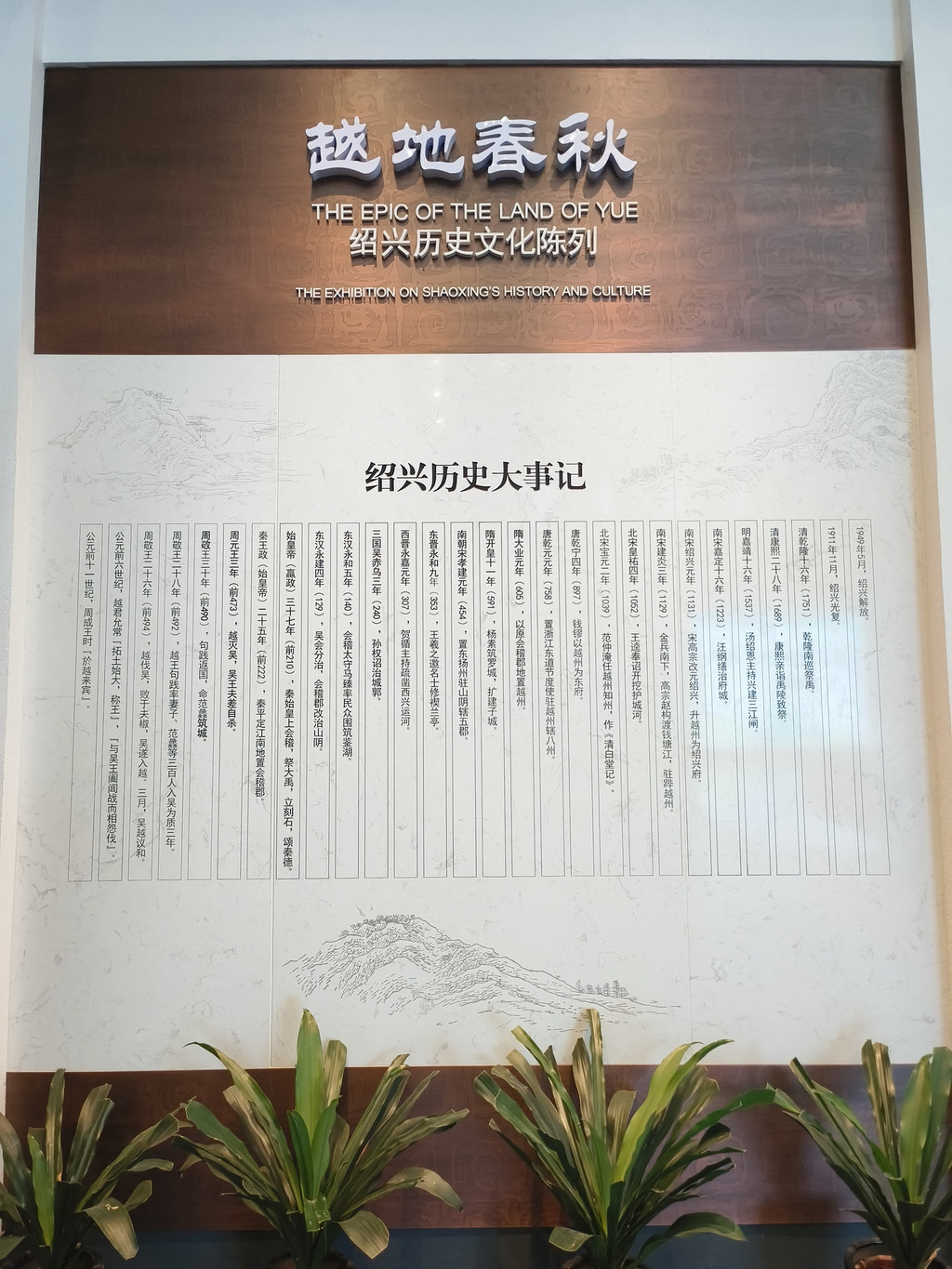 绍兴古称越州、会稽、山阴。“绍兴”之名来自宋高宗赵构的诏书“绍奕世之宏休,兴百年之丕绪”,继往开来、中兴伟业的意思。多年前来过这座历史文化名城,游览了鲁镇、鲁迅故里、兰亭、黄酒博物馆等地。这次重点看了“四个一”:一馆(绍兴博物馆)、一园(镜湖湿地公园)、一棵树(香林村中国桂花王)、一朵花(棠棣村兰花)。跟以往一样,博物馆作为第一站。