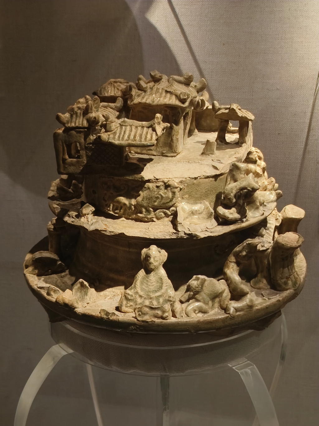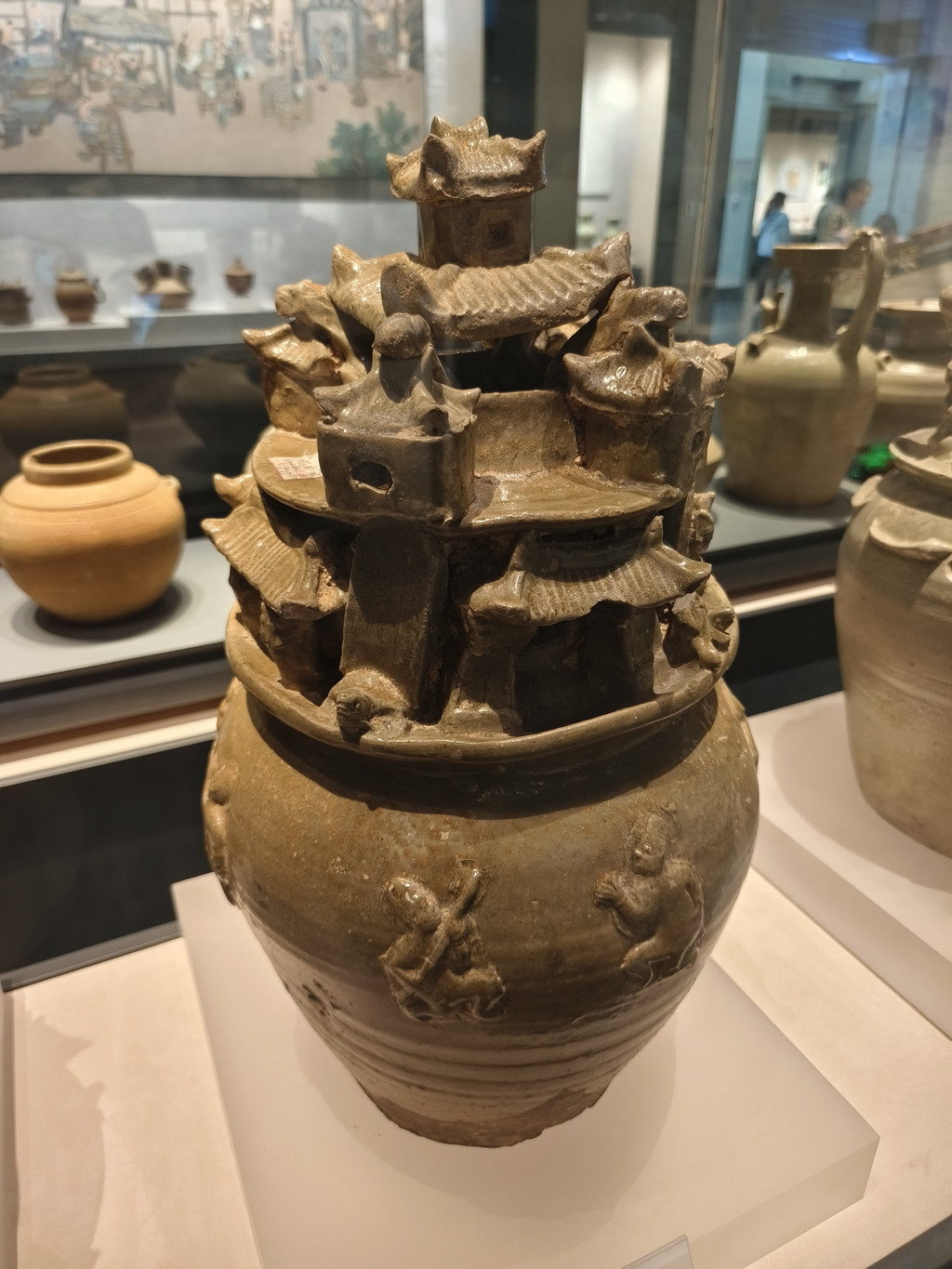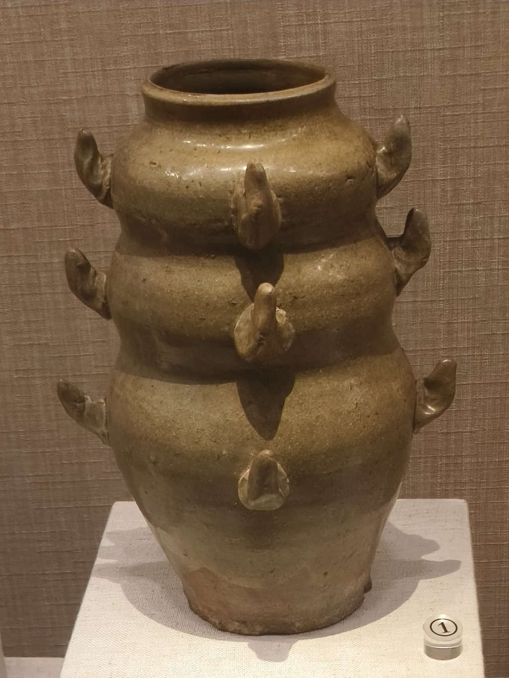 晋代青釉瓷谷仓罐。谷仓罐又称魂瓶、堆塑瓶,流行于三国、西晋时期,由东汉的五联罐演变而来,是江南地区代表性的随葬明器。这次在临海、金华、绍兴博物馆都看到了此类文物。