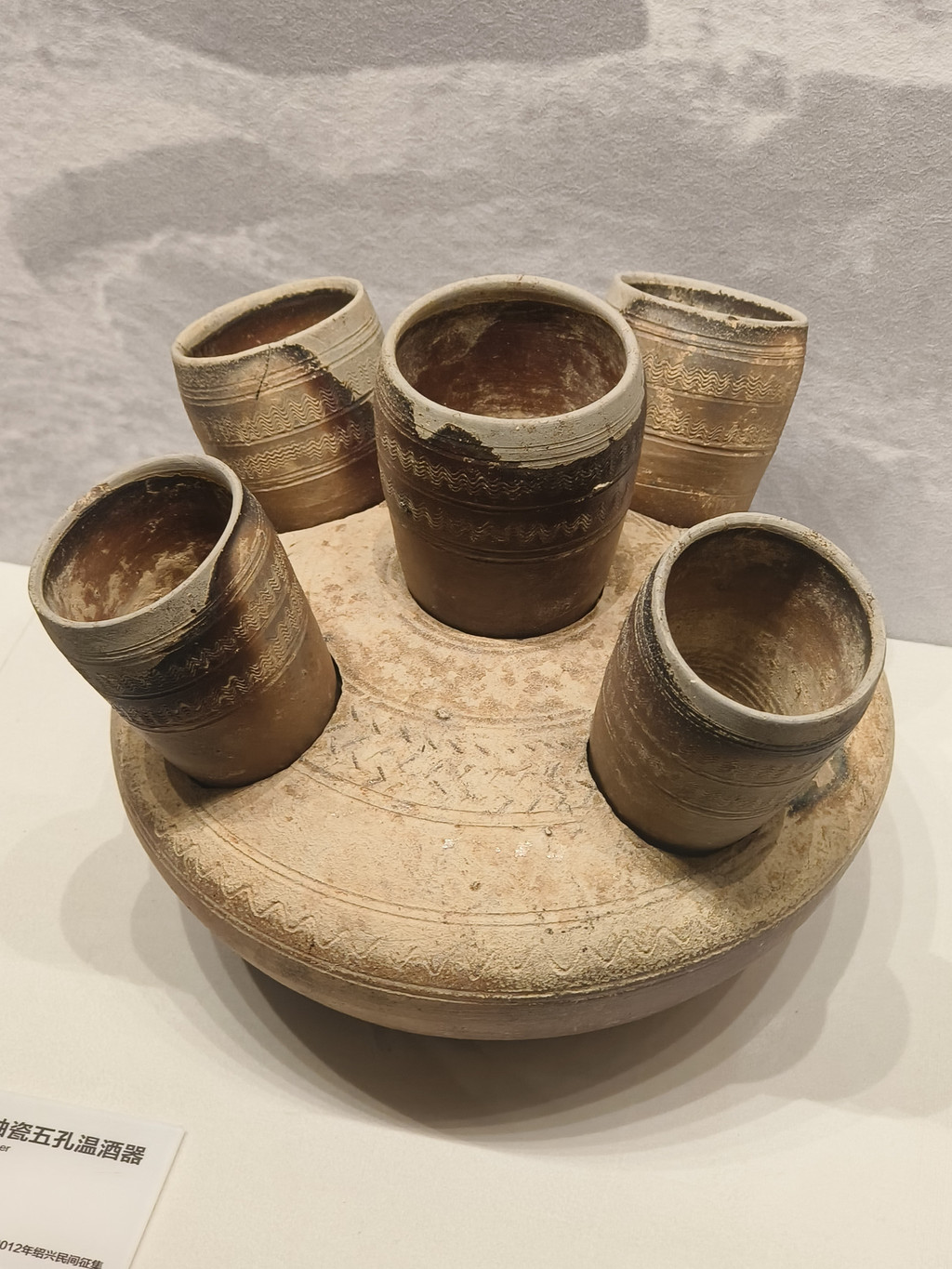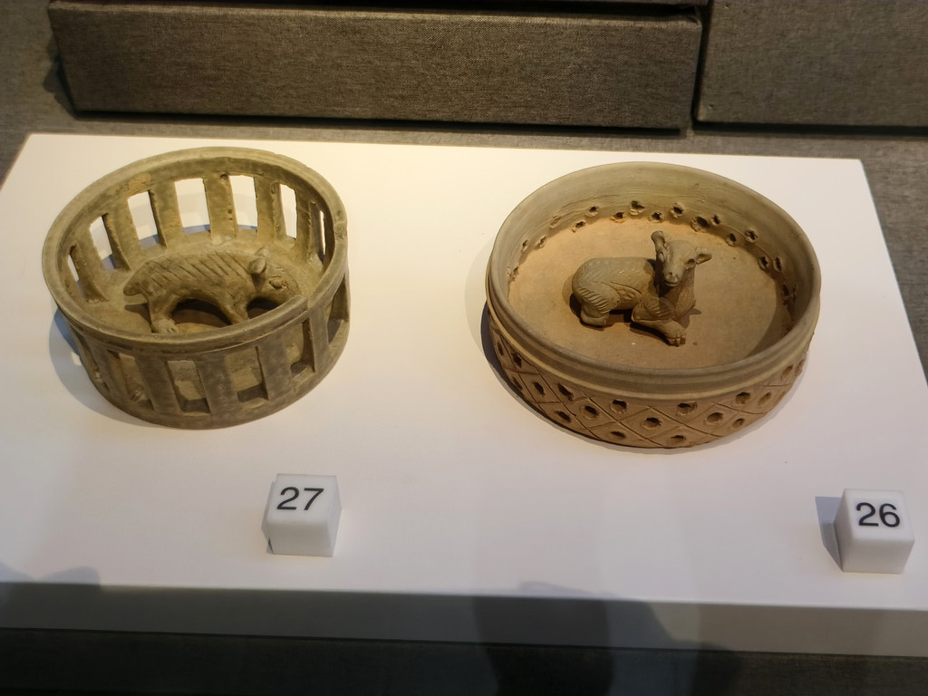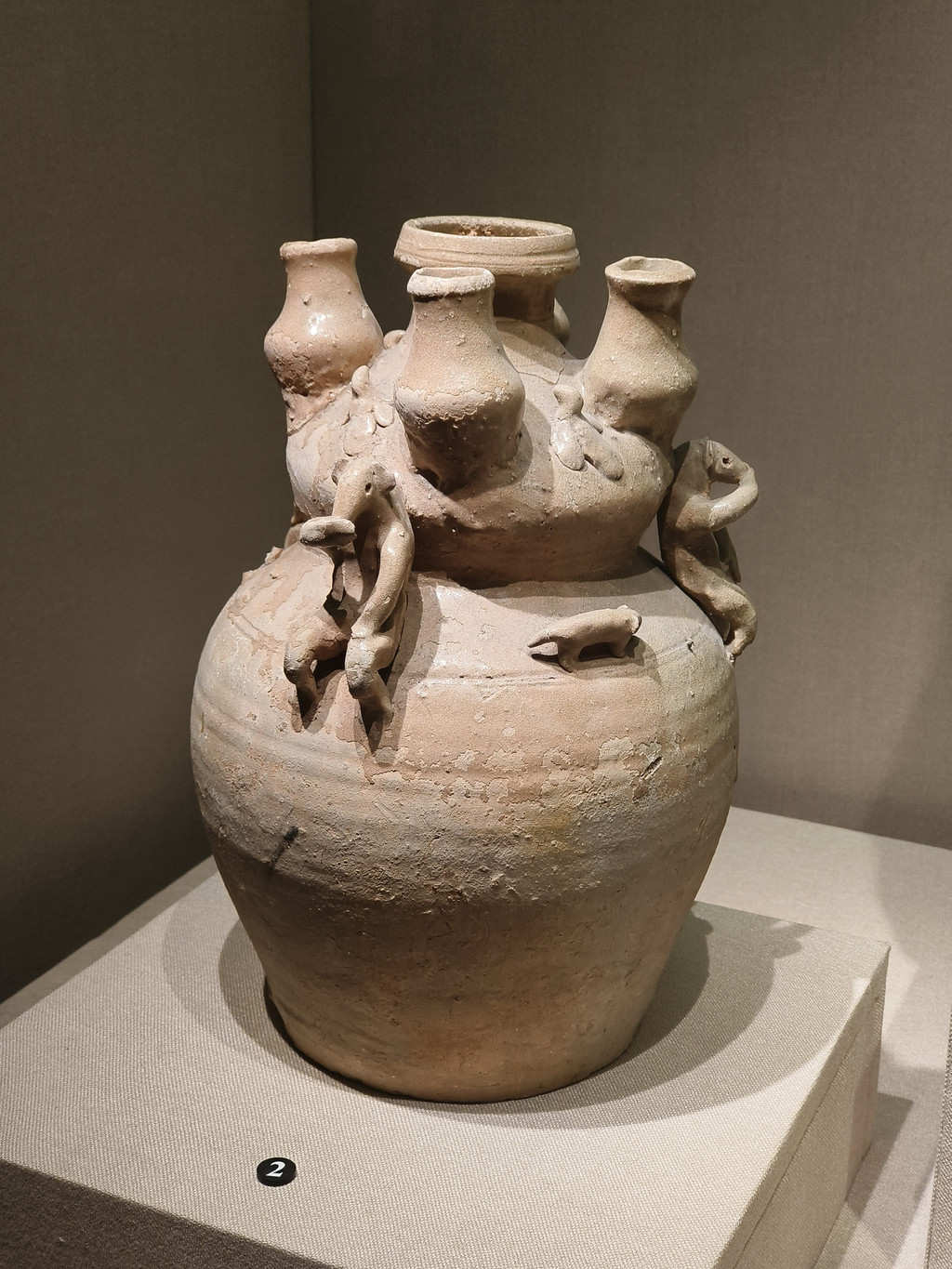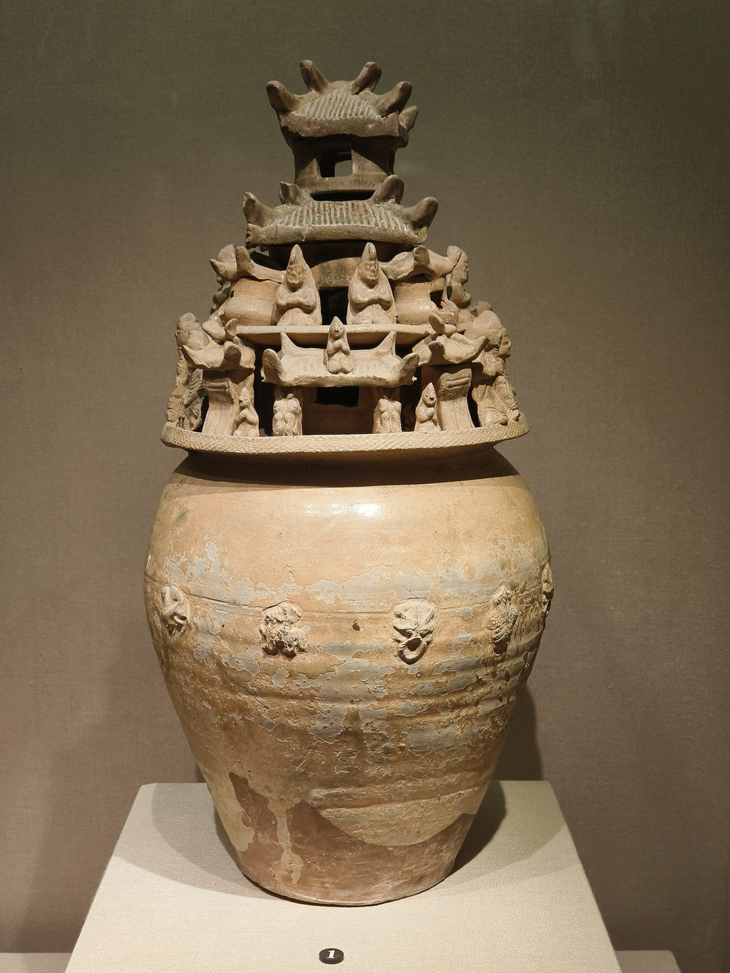 晋代青釉瓷谷仓罐。谷仓罐又称魂瓶、堆塑瓶,流行于三国、西晋时期,由东汉的五联罐演变而来,是江南地区代表性的随葬明器。这次在临海、金华、绍兴博物馆都看到了此类文物。