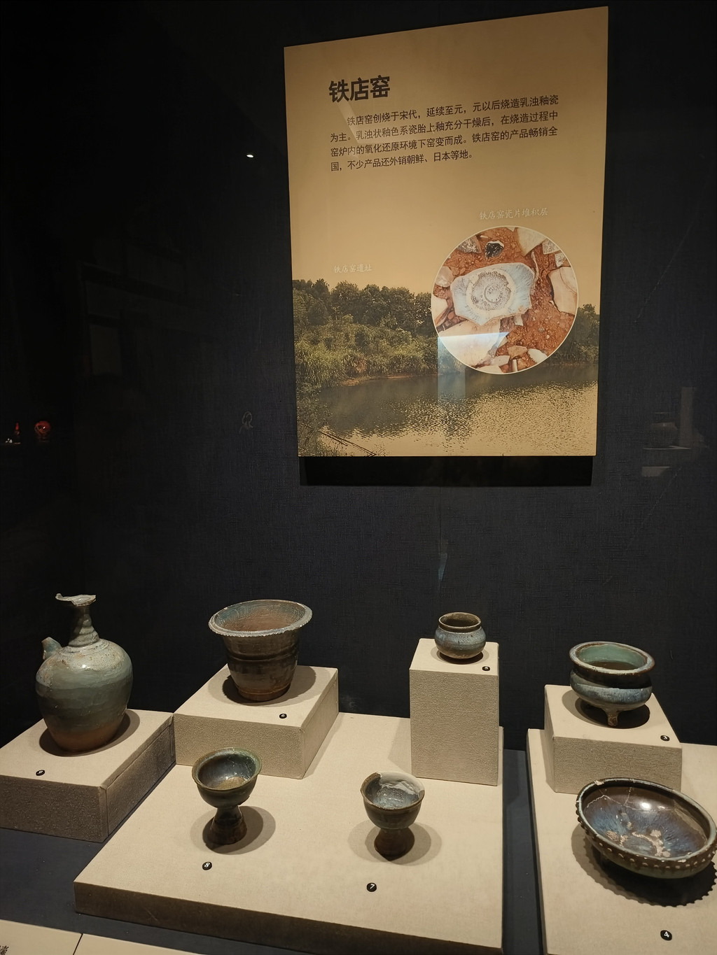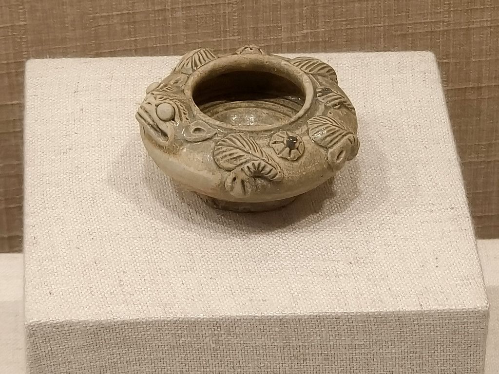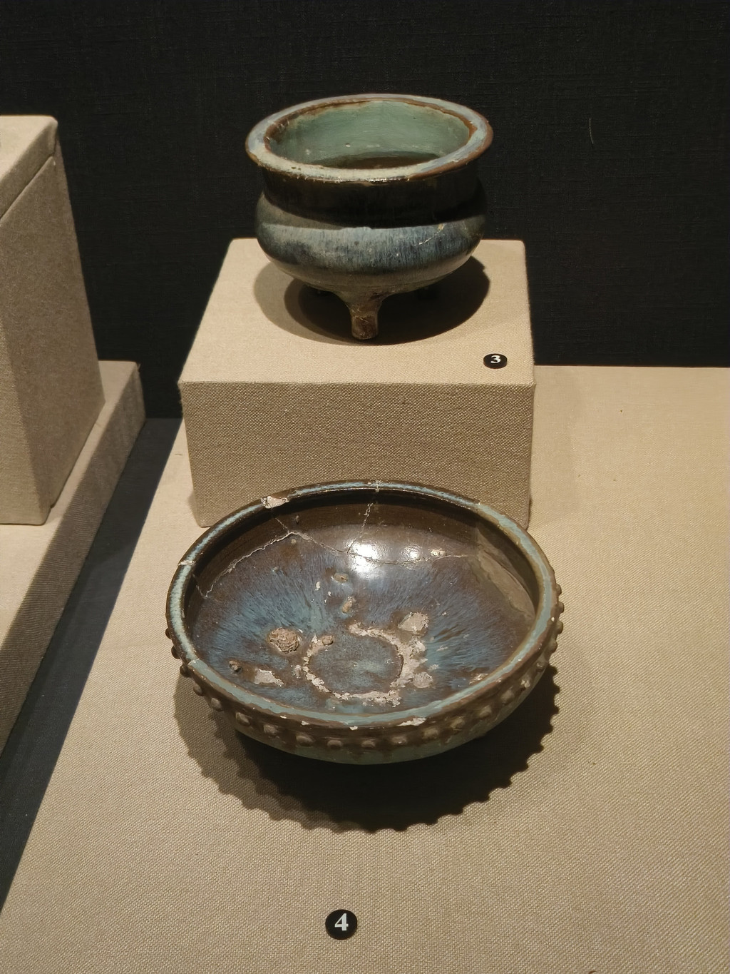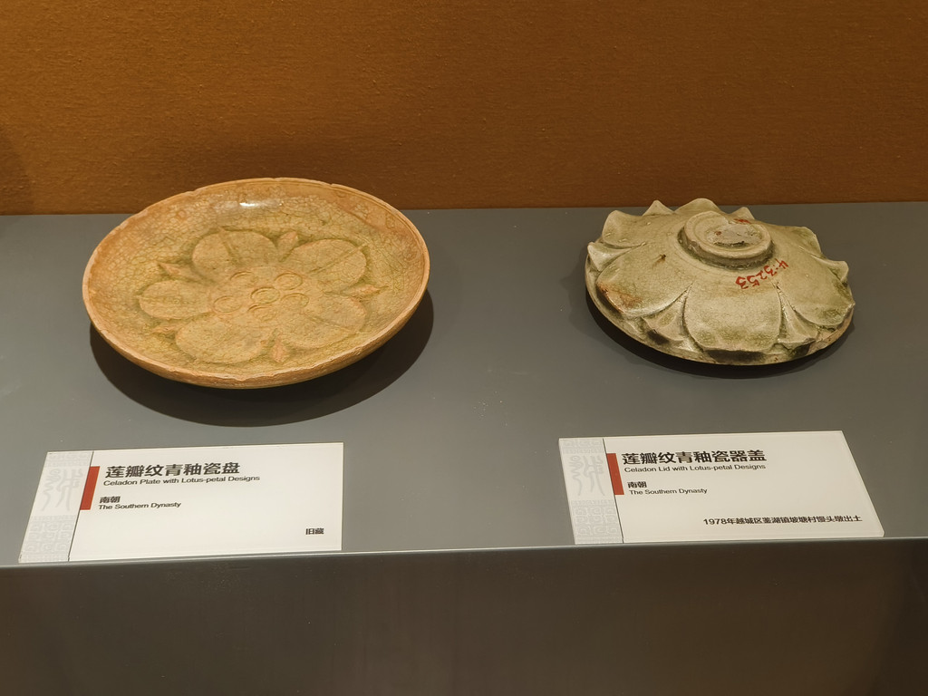 莲瓣纹青釉瓷盘、瓷器盖(南朝)。“南朝四百八十寺,多少楼台烟雨中”,南北朝时期佛教兴盛,莲瓣纹装饰极为流行,成为此时越窑风格的典型。