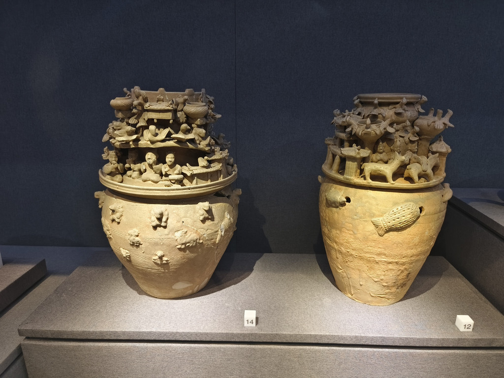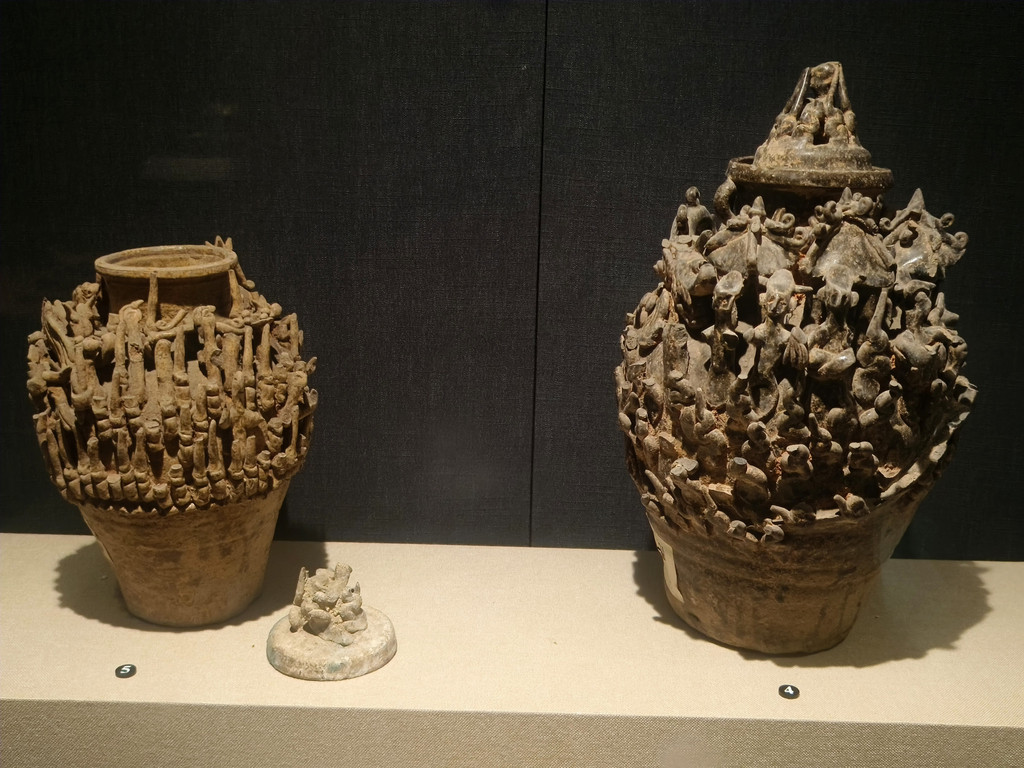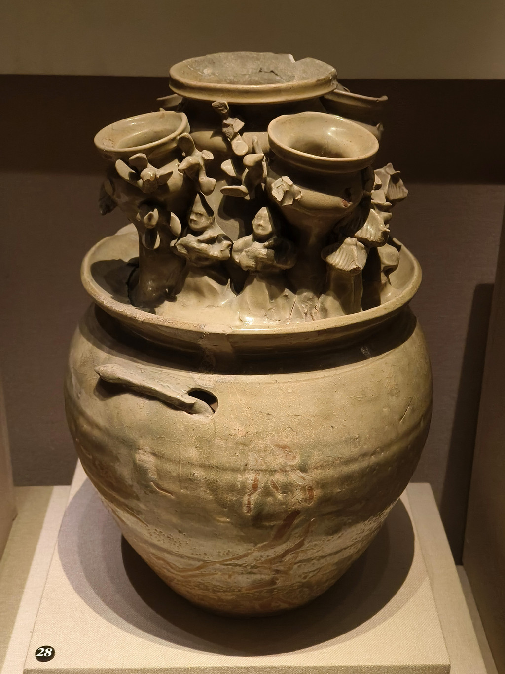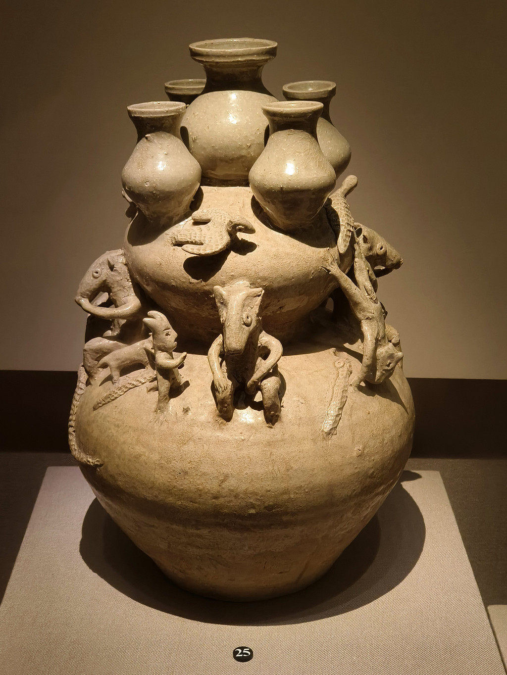 “会稽”青釉瓷堆塑罐(西晋)。明器。分上下两部分,上部以人物、建筑为主,下部贴饰人物、动物,寓意五谷丰登、人丁兴旺。这次在四家博物馆都看到了这类五联罐、谷仓罐、堆塑罐,反映了古代江南地区“事死如事生”的风俗,对安详生活的憧憬、对长生不老的追求。