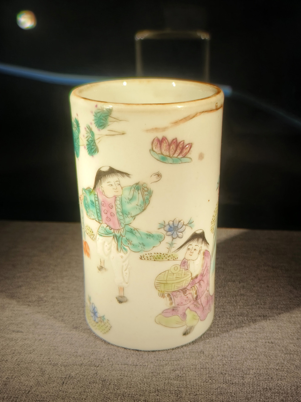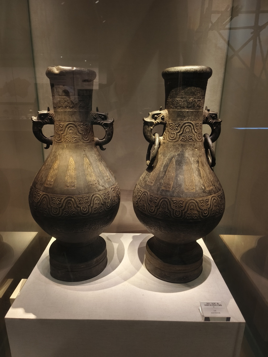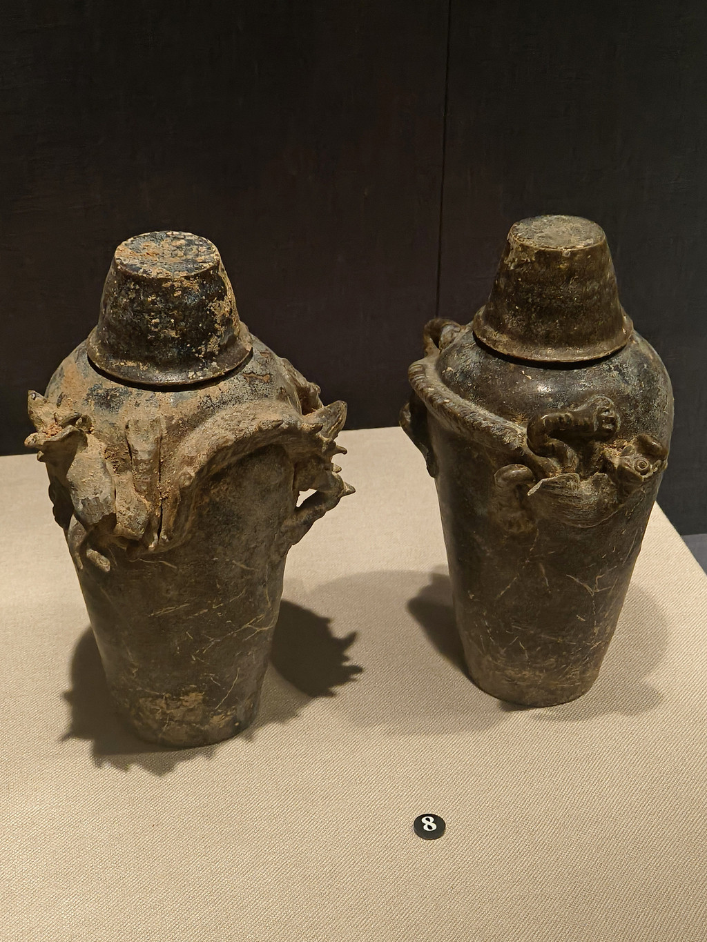 “会稽”青釉瓷堆塑罐(西晋)。明器。分上下两部分,上部以人物、建筑为主,下部贴饰人物、动物,寓意五谷丰登、人丁兴旺。这次在四家博物馆都看到了这类五联罐、谷仓罐、堆塑罐,反映了古代江南地区“事死如事生”的风俗,对安详生活的憧憬、对长生不老的追求。