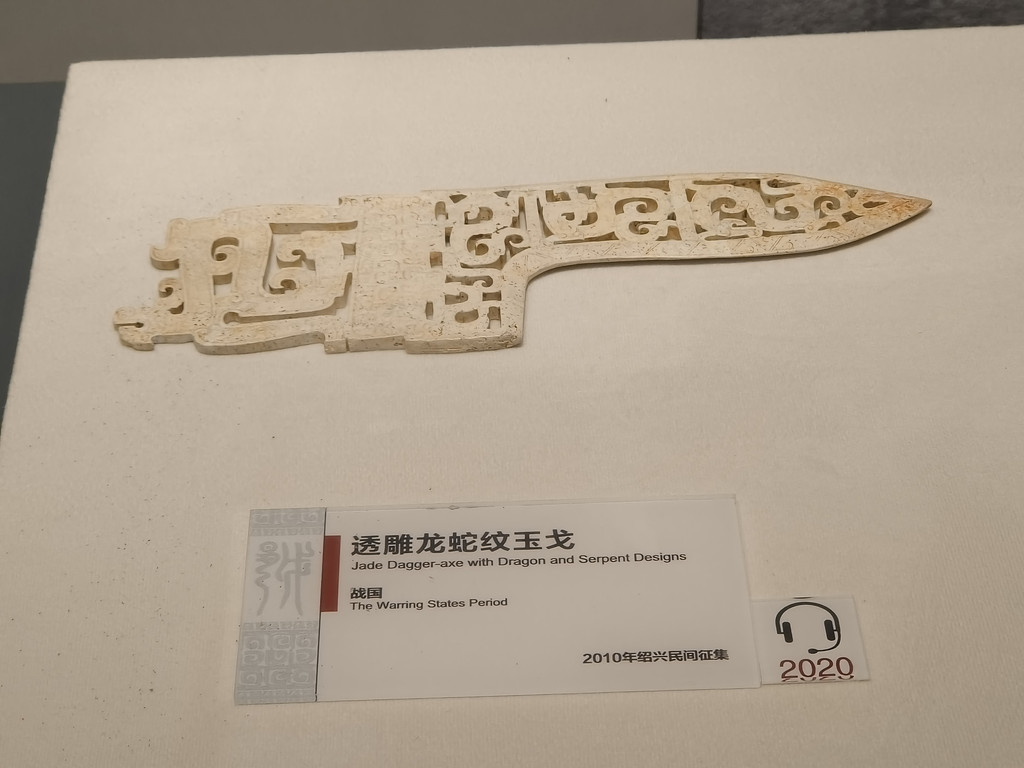 透雕龙蛇纹玉戈(战国)。主饰纹为透雕蟠龙、蛇和鹰首,辅助饰纹为线刻龙须、龙鳞、蛇鳞、勾连纹和三角纹等。